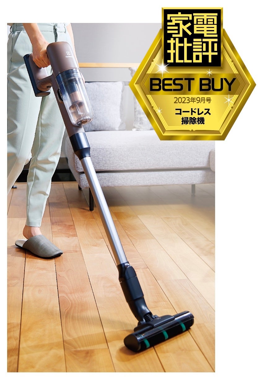 ハイレベルな争いが繰り広げられた掃除力のテストで7製品中3位の好結果だったのに加え、使い勝手も良好。実際に使い比べると、女性でも扱いやすいサイズ感や、部屋中掃除しても腕が疲れない軽さ、ヘッドの柔軟性がもたらす操作性のよさを実感できます。高い掃除力と、長時間掃除をしても疲れないサイズと軽さ、さらには見える場所に置いてもジャマにならないデザイン性の高さ。この三拍子がそろったエレクトロラックスは、家族で使うコードレス掃除機としておすすめです。