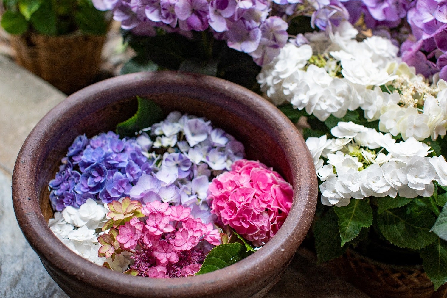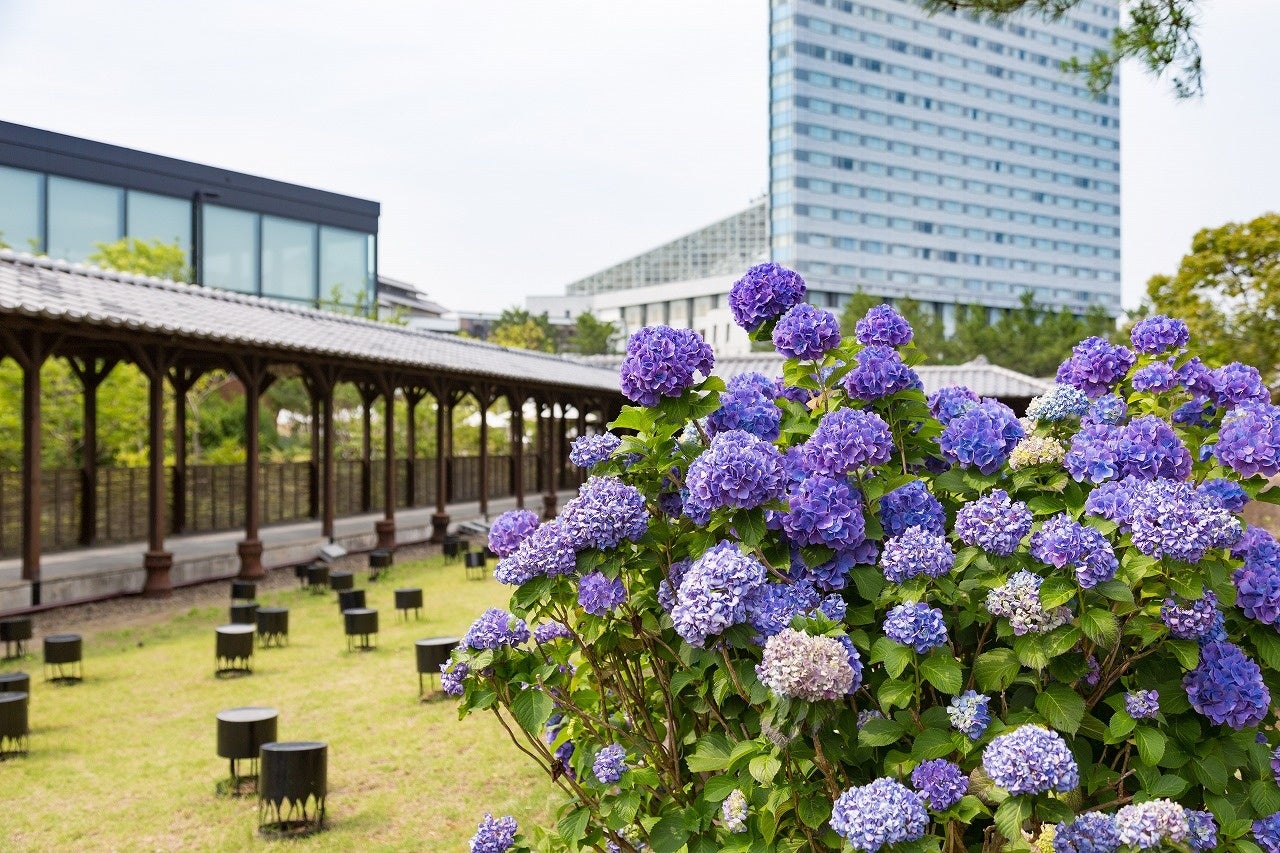 「松泉宮」ゆかたウォークや湯上り後の休憩スペース「ティーテラス」前には、水に花を浮かべた手水鉢「花手水」(はなちょうず)や雨露をまとった約150株の色鮮やかなあじさいが咲き誇ります。