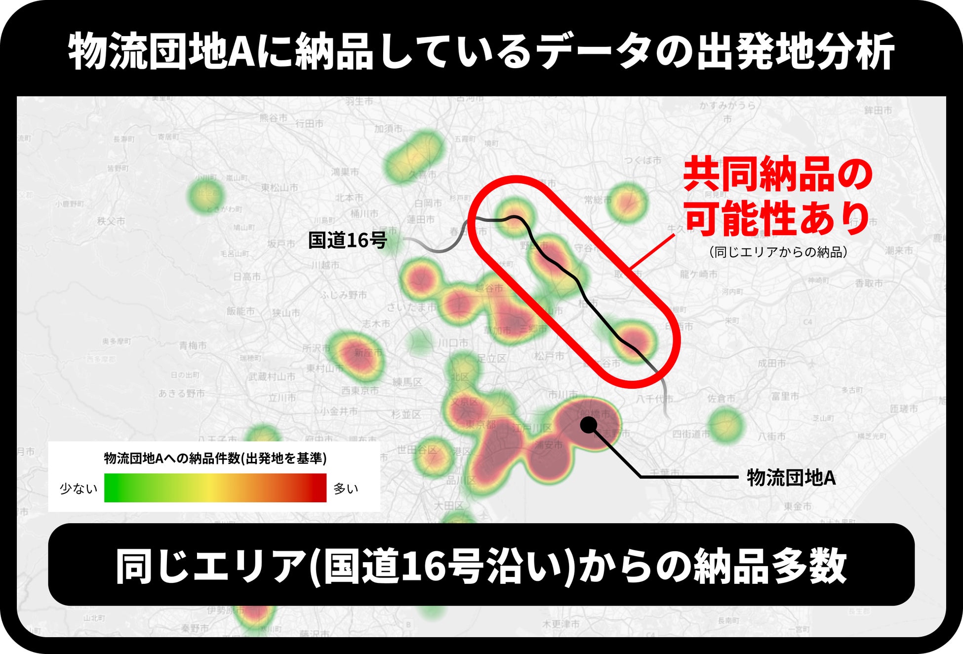 抽出したデータを分析した結果、ある1日において、国道16号沿いを出発地として、小型トラックで類似品目を同時刻に納品している実績があることが分かりました。このことから、事業者を超えた共同納品を実現できる可能性があることが明らかになりました。