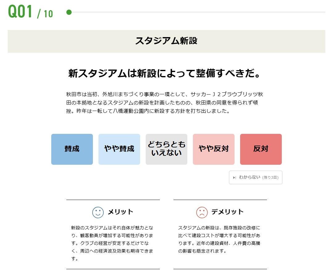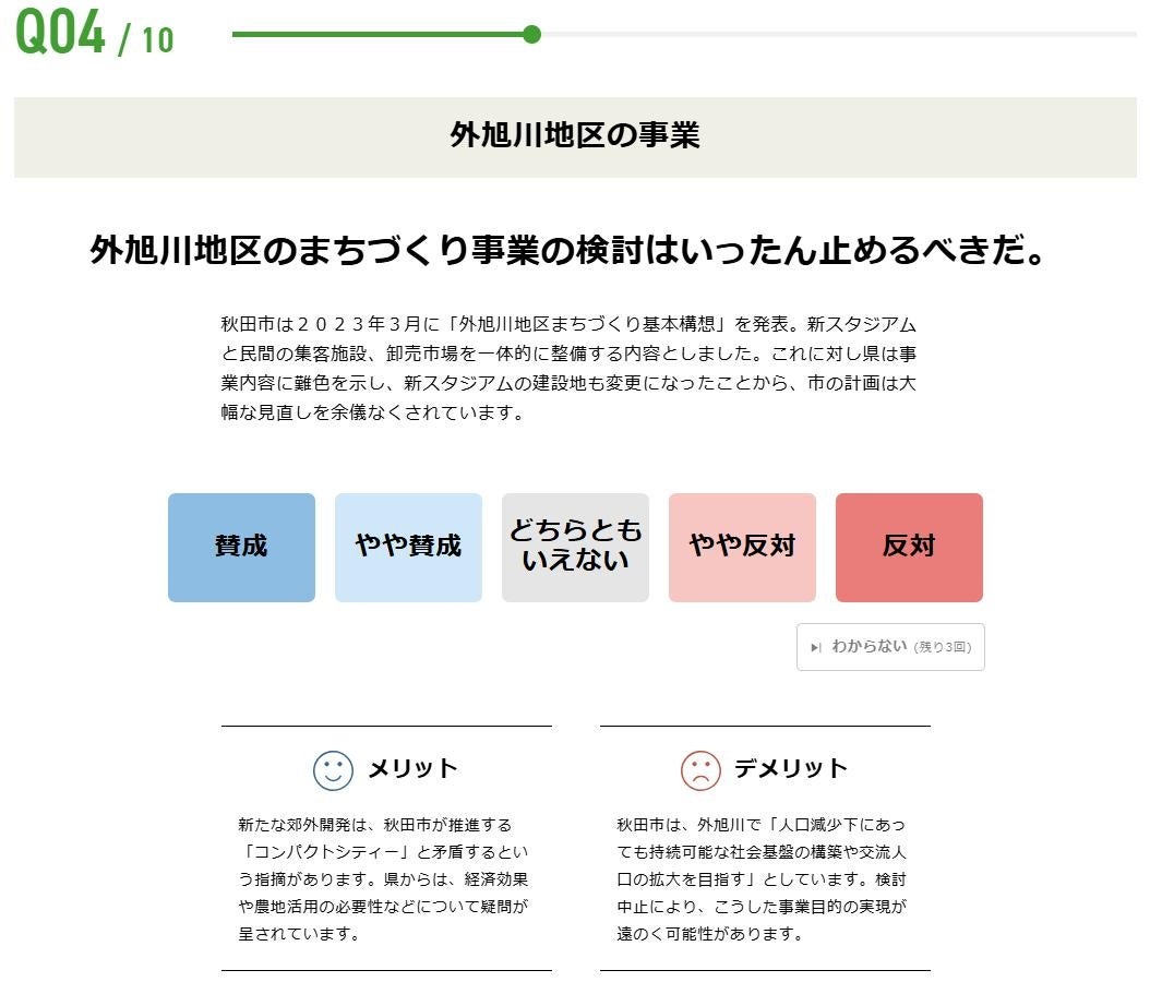 今回の市長選の「争点」として挙げられている「新スタジアム建設のあり方」「外旭川地区のまちづくり事業」「災害対策の予算拡充」など幅広い分野の設問になりますが、全ての質問に概要を説明する「解説文」と「メリット」「デメリット」を記載することで、利用者の判断材料をご提供します。