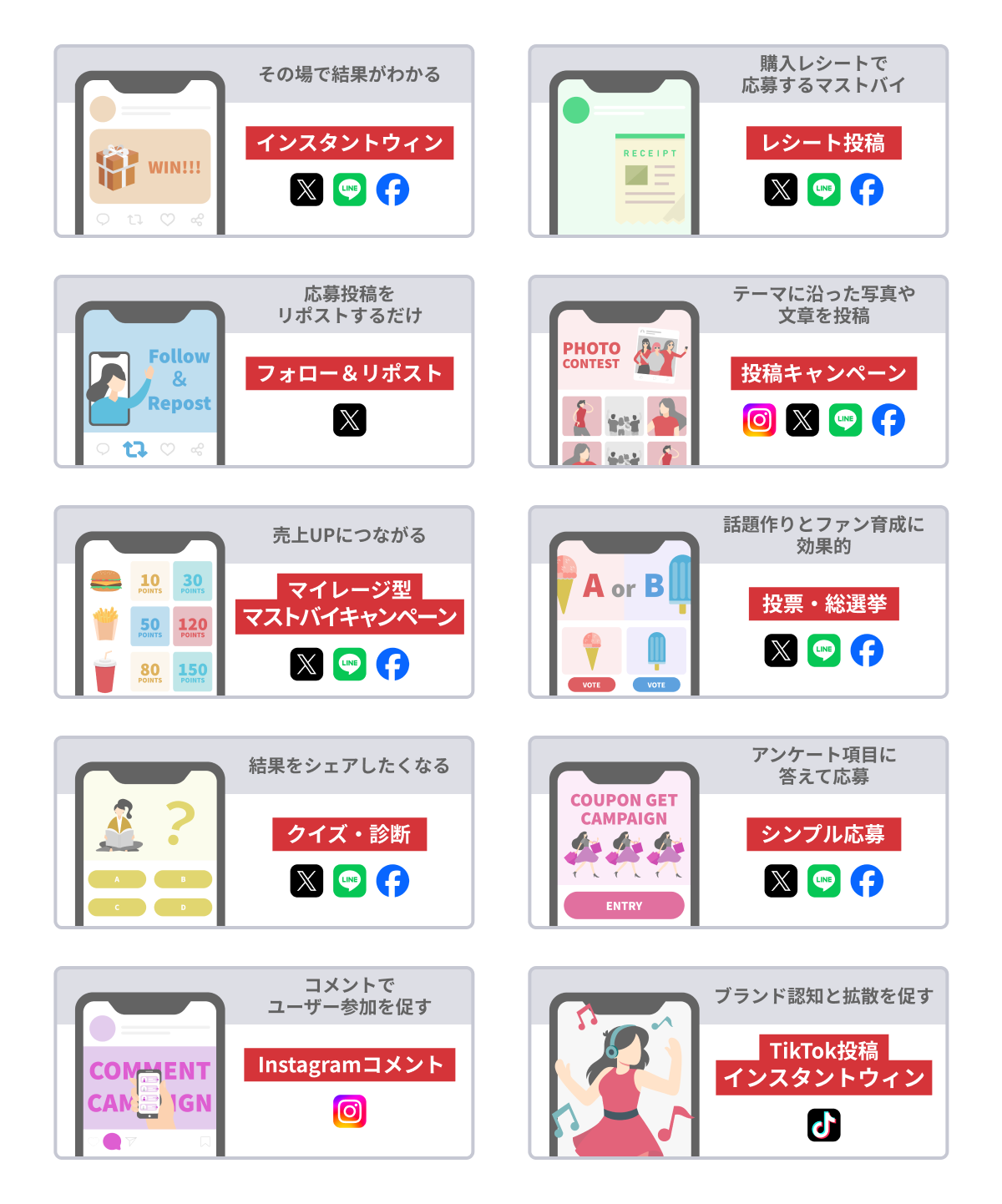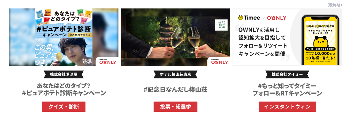 ユーザーと良質なコミュニケーションを構築するために、それぞれのブランドや公式アカウントのフェーズに合わせてSNS施策を展開する必要があります。OWNLYでは、X(旧Twitter)とInstagram、LINEなどを横断し、15種類以上のキャンペーンタイプを定額で回数無制限に実施できます。