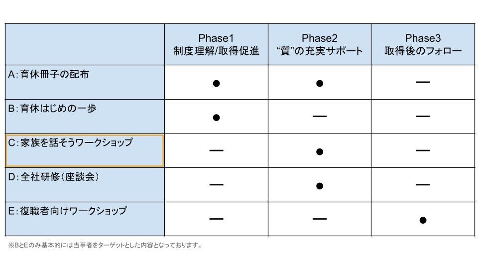 そこで、「とるだけ育休※」を防ぎ、育休の質を向上させることで、復帰後も希望する形で仕事と家庭を両立しながら活躍できるよう、男性育休サポートプログラムの「家族を話そうワークショップ(当事者向け)」を提供することとなりました。