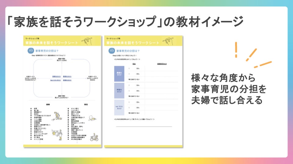 夫婦で参加いただき、育休や家事・育児分担や家族の未来について話し合う機会を提供します。