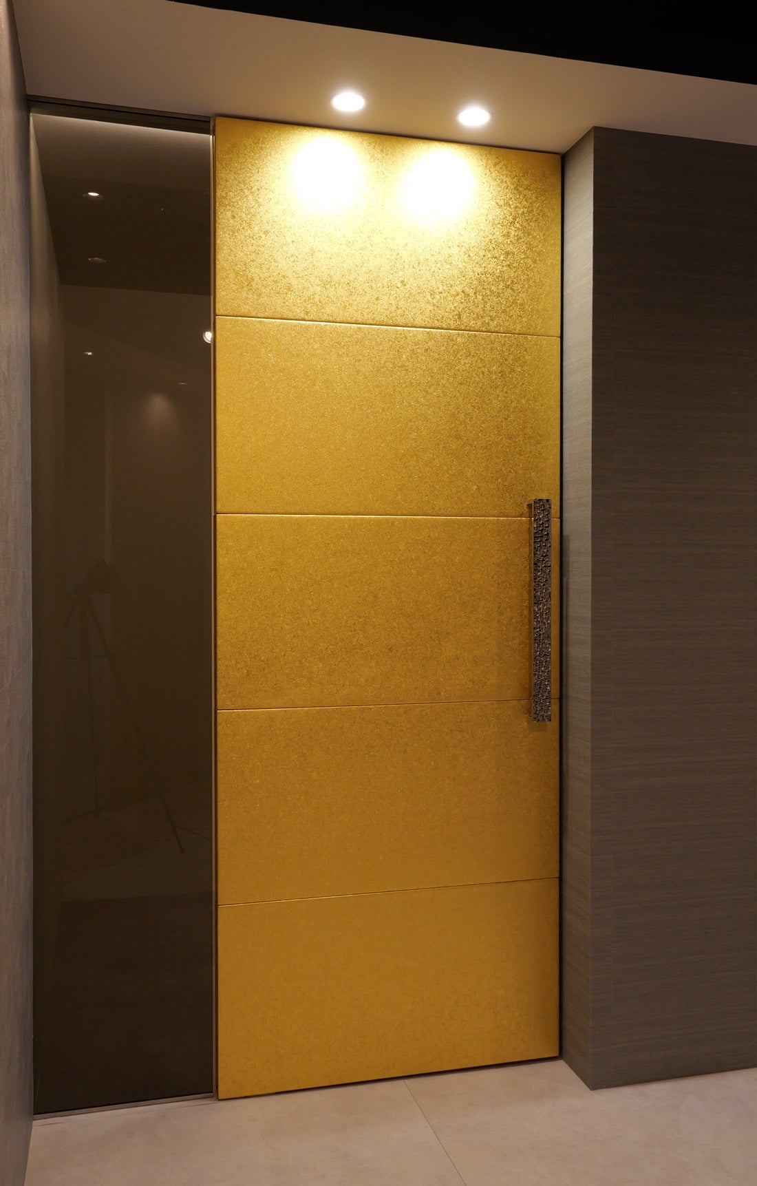2024年1月に発売した「ジパング」は、石川県・金沢産の金箔「金沢箔」を本牛革に貼りつけた金箔レザーをドア全面にあしらった商品です。日本の製箔技術は世界一と言われ、職人の技術によって 1 万分の 1 ミリという薄さを実現。それを何層にも重ねることで、プリントでは再現できない繊細な紋様が現れます。 本製品は、金沢の金箔を京都で革に貼付け、神奈川の自社工場で最終的にドアとして完成します。日本全国で培われた技術の粋を集めて完成したドアは世界に誇る Made in JAPAN プロダクトです。
