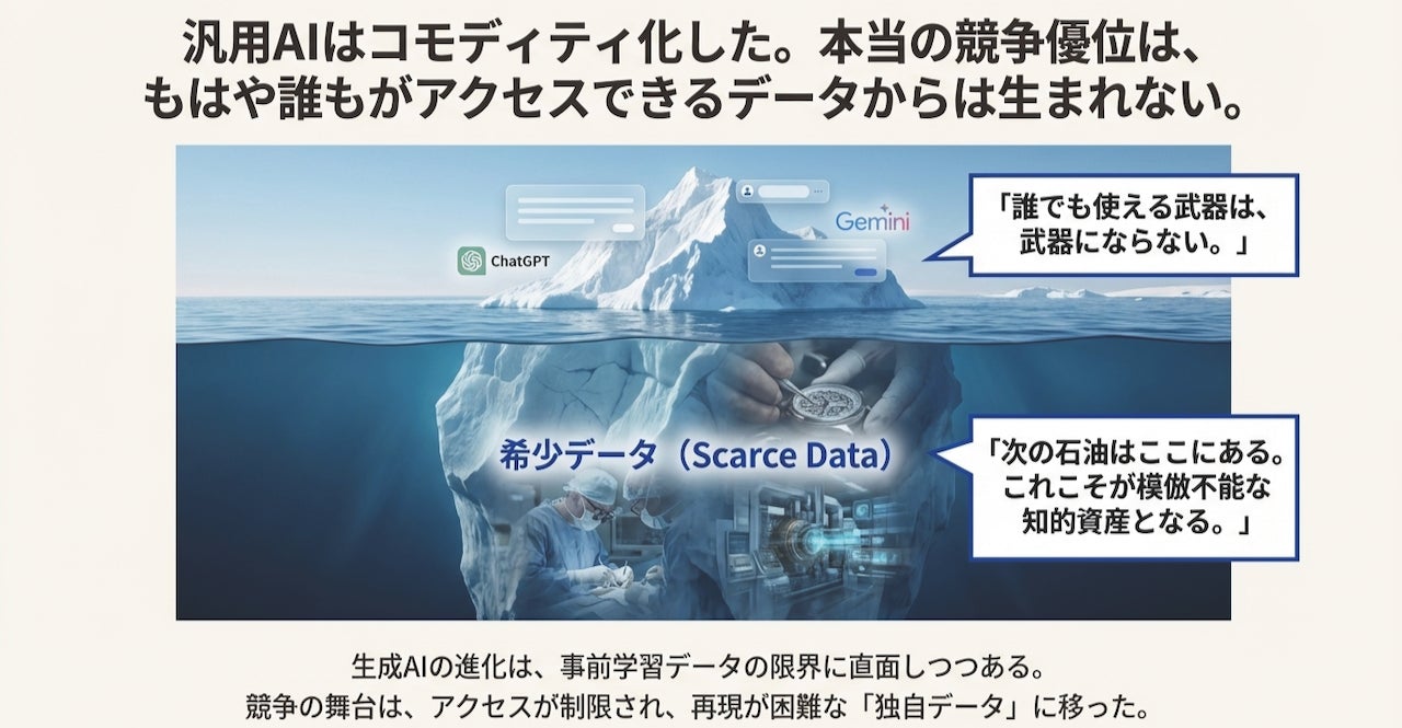 「生成AIツールの民主化により、誰もが高度なアウトプットを得られる時代になりました。しかし、それは同時に『誰もが同じ答えしか得られない』時代でもあります。真の差別化は、AIに何を学ばせるか、すなわち独自の教師データにかかっています。
