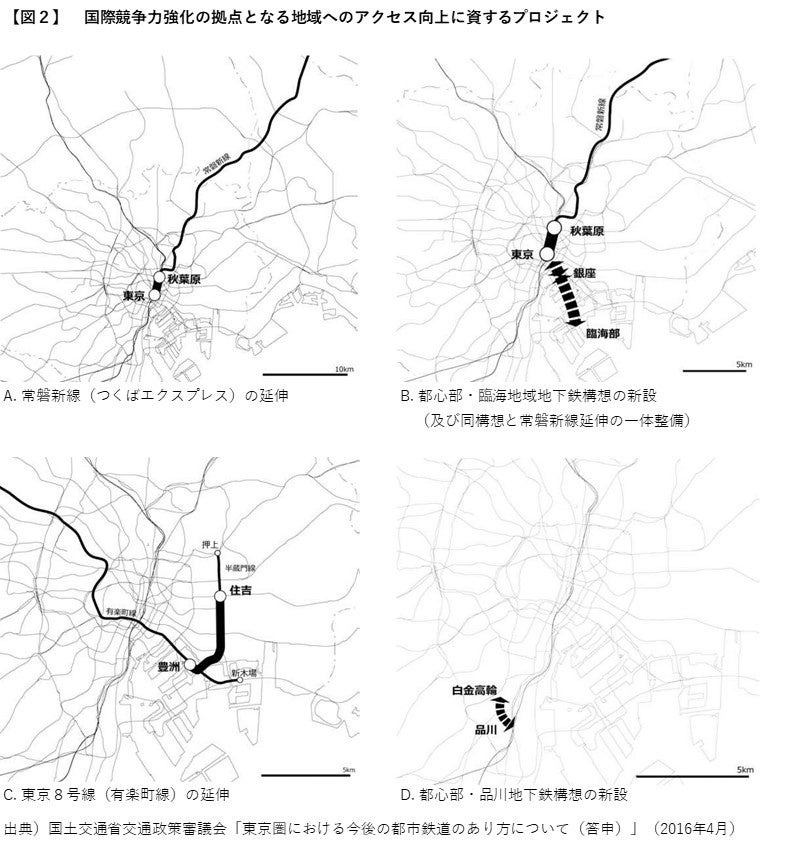 東京圏の国際競争力強化に向けた都市鉄道計画として、①空港アクセスの向上に資する4プロジェクト【図1】と ②国際競争力強化の拠点となる地域へのアクセス利便性の向上に資する5プロジェクト【図2】が示されています。