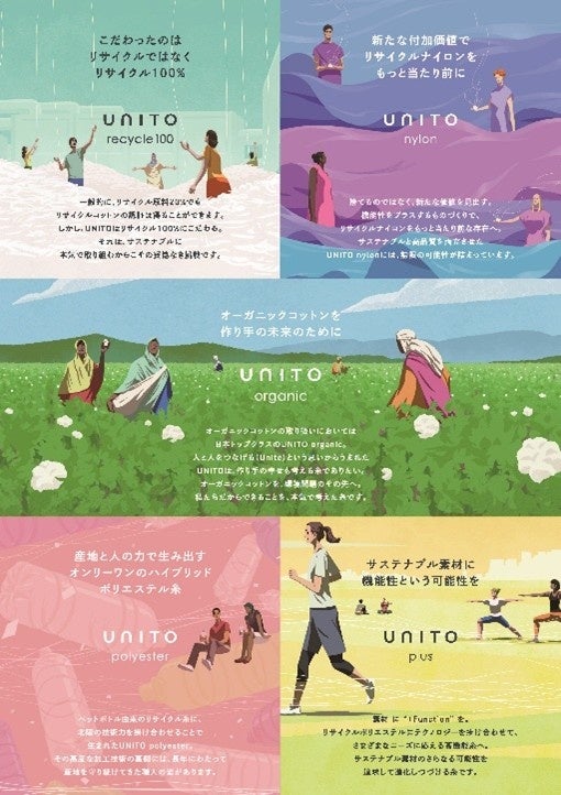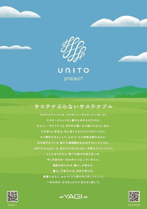 当社の環境配慮型素材シリーズ「ユナ・イト(UNITO)」そのサステナブルは、ただのトレンドになっていないか。そのオーガニックは、誰のためのものなのか。そのトレーサビリティは、作り手の想いまで届けられているか。その安心と安全は、目に見えるかたちにできているか。その素材があることで、ものづくりの世界は変わるのか。次の時代をつくる 、新たな価値観を生み出そうとしているか。UNITO projectは、見せかけだけじゃない本気のサステナブル。人と人はもちろん、数十年後の未来を見つめ、今と次世代を一本の糸でつないでいきたい。繊維が変われば、暮らしが変わる。暮らしが変われば、未来が変わる。言葉ではなく、ものづくりで世の中に示していこう。一本の糸が、そのきっかけになれると信じて。UNITO公式Webサイト:https://unito-project.com/