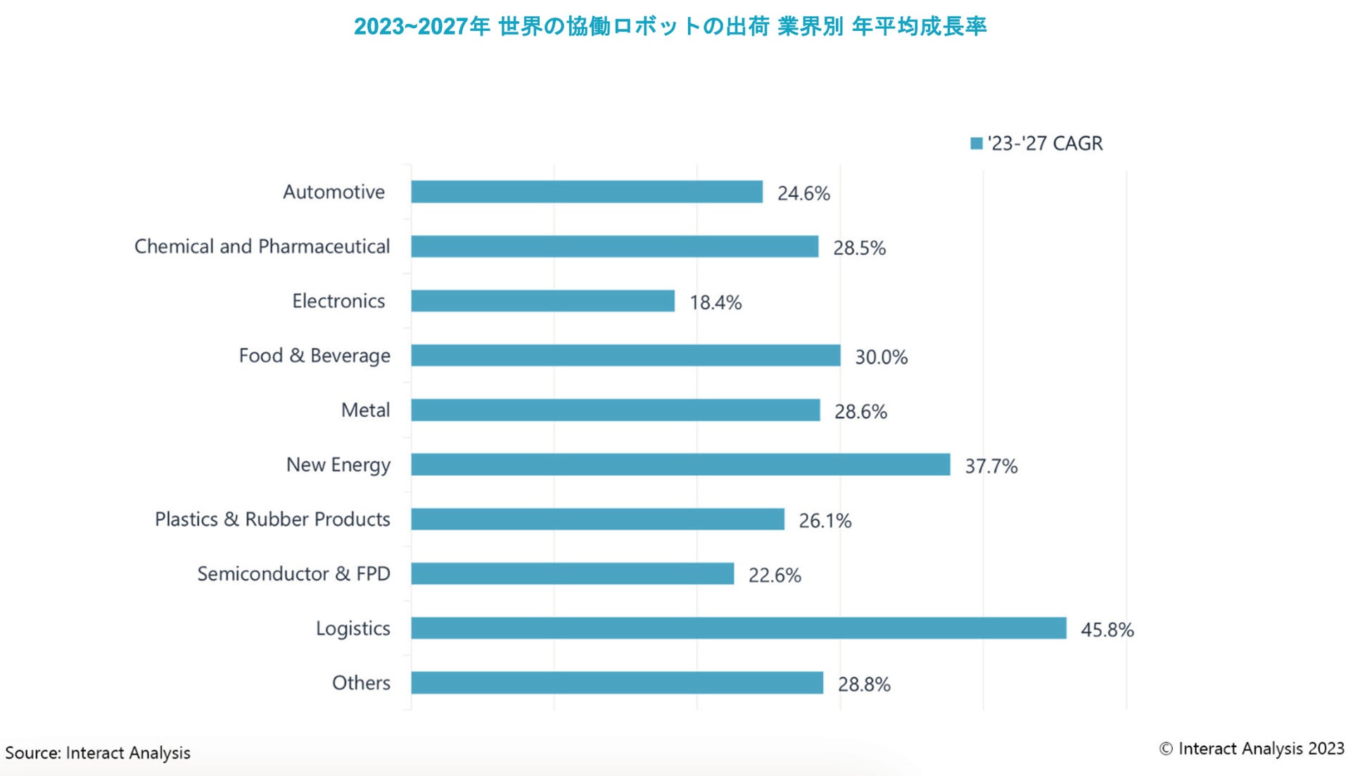 また産業別に見ると、2022年の世界的な経済の落ち込みの影響を受けたサービス産業での普及は減速傾向にありますが、パンデミック後に休業や人手不足に悩まされてきた製造業では、生産ラインのアップデートや改修に伴い、協働ロボットの需要が高まっています。Interact Analysisのレポートによると、2022年に協業ロボットの成長率が最も高かった業界は、リチウムイオン電池、風力発電、太陽光発電、水素などの次世代エネルギー業界で、これに自動車とエレクトロニクスが続いています。また、食品 / 飲料、化学 / 医薬品などの業界でも安定した需要があるようです。**