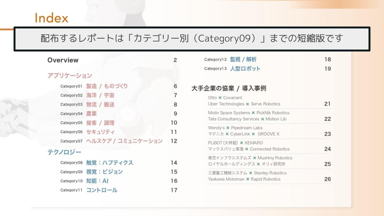 本レポートでは、いわゆる産業用ロボットアームだけに限らず、人間との関わりや対話によって生産性やサービスの向上に貢献するロボットも含めた、やや広義の協働ロボットに注目し、適用業界と関連技術のカテゴリー別に国内外の有望なスタートアップをご紹介します。
