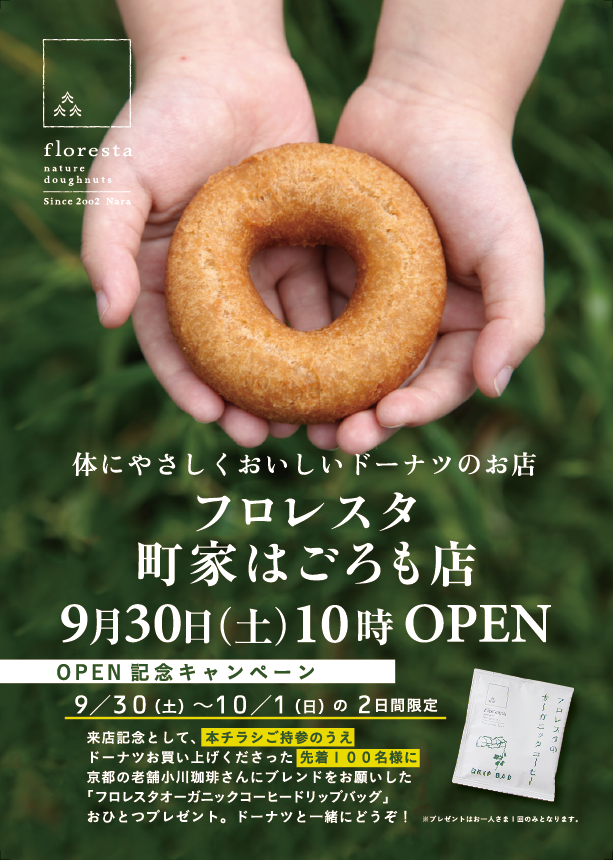 体にやさしい自然派ドーナツのお店「フロレスタ町家はごろも店」9月30日(土) グランドオープン!OPEN記念キャンペーンも開催。大阪府高石市羽衣