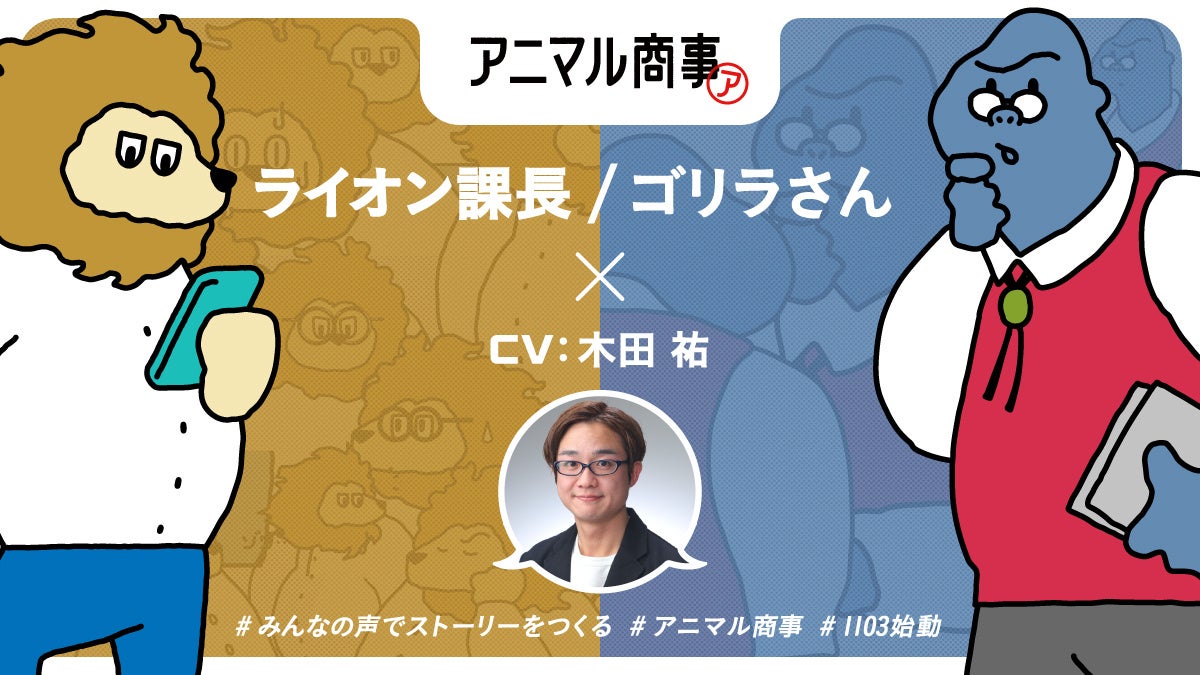 本作では、アニメファンにもおなじみの豪華声優陣にキャラクターを演じていただきました。配信開始に先駆け、大塚明夫氏が演じる「キリン本部長」と、春瀬なつみ氏が演じる「サメ課長」「ナレーター」、木田祐氏が演じる「ライオン課長」「ゴリラ課長」のキャラクタービジュアルを公開いたします。