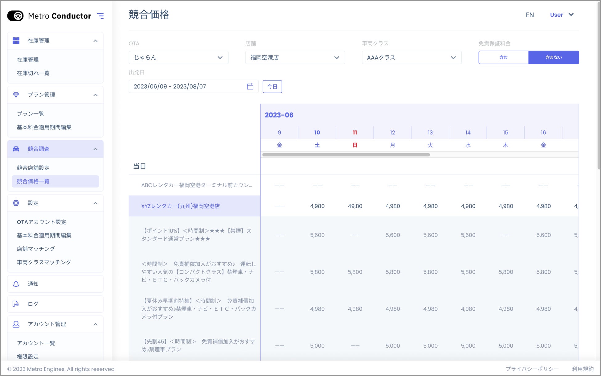 『メトロコンダクター』は、複数のOTAの予約サイトの在庫の一括管理や競合の販売価格調査といった、事業運営の効率化や売上の最大化をサポートするレンタカー事業者向けシステムです。
