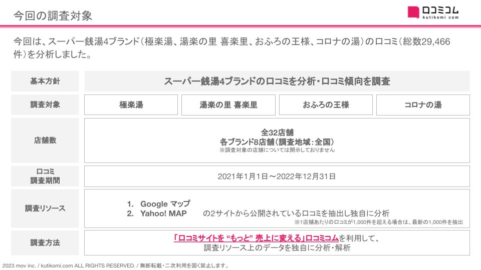今回は、スーパー銭湯4ブランド(極楽湯、湯楽の里 喜楽里、おふろの王様、コロナの湯)の口コミ(総数約1.5万件)を調査し、比較検証を行いました。