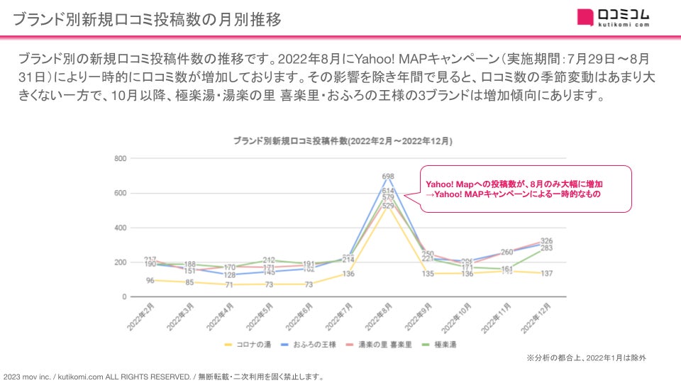 ブランド別の新規口コミ投稿件数の推移です。2022年8月にYahoo! MAPキャンペーン(実施期間:7月29日〜8月31日)により一時的に口コミ数が増加しております。その影響を除き年間で見ると、口コミ数の季節変動はあまり大きくない一方で、10月以降、極楽湯・湯楽の里 喜楽里・おふろの王様の3ブランドは増加傾向にあります。