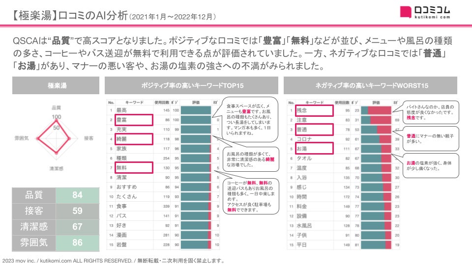 それらのAI解析を用いた分析例として【極楽湯】のQSCA・頻出ポジネガキーワードを確認しました。