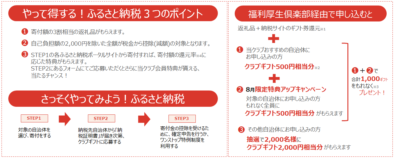 福利厚生アウトソーシングサービスのトップカンパニーである株式会社リロクラブ(東京都新宿区、代表取締役社長 岡本 盛 https://www.reloclub.jp/)が運営する福利厚生倶楽部の「ふくりのふるさと納税」では、当クラブ経由でお申し込みいただくと「返礼品+納税サイトのギフト券還元※1+クラブギフト500円相当分※2」のキャンペーンにプラスして、さらに対象の自治体にお申し込みいただくと、もれなく全員に500ギフトがもらえ、合計1,000ギフトが付与される「特典UPキャンペーン」を8月限定でスタートいたしました!