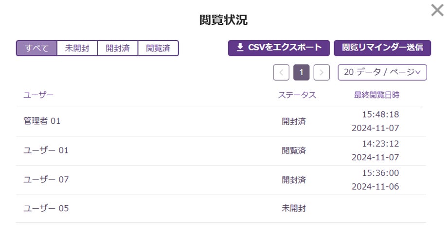 閲覧状況管理機能:新しいマニュアルの公開や、マニュアルの更新を行った際に、閲覧者へ通知を送ることが可能になりました。また、閲覧者ごとにマニュアルの閲覧状況が表示できるようになり、リマインダーの送信も可能になりました。