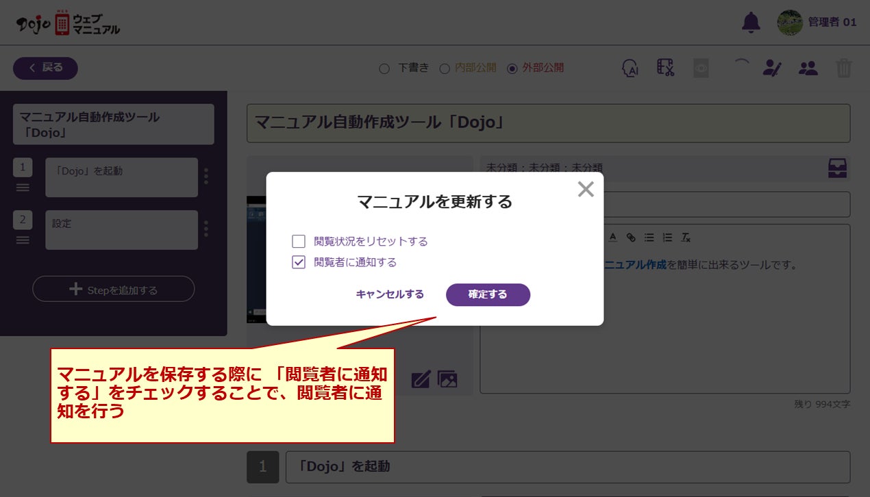 これまでの「Dojoウェブマニュアル」には、新しいマニュアルの公開時や、既存のマニュアルの更新時に、プッシュ通知をする機能がありませんでした。新しいマニュアルの公開や既存のマニュアルの更新が起こるタイミングは、業務のやり方が定められたり、業務の進め方が変更になったりすることが多くあります。今回実装した閲覧状況管理機能マニュアル公開時の通知や、リマインド送信の機能を活用いただくことで、閲覧者が最新のマニュアルを参照し、正しく業務を進めるための仕組み作りに役立つものと考えています。