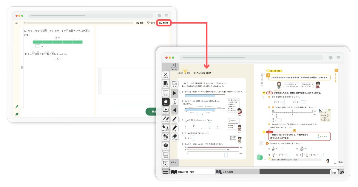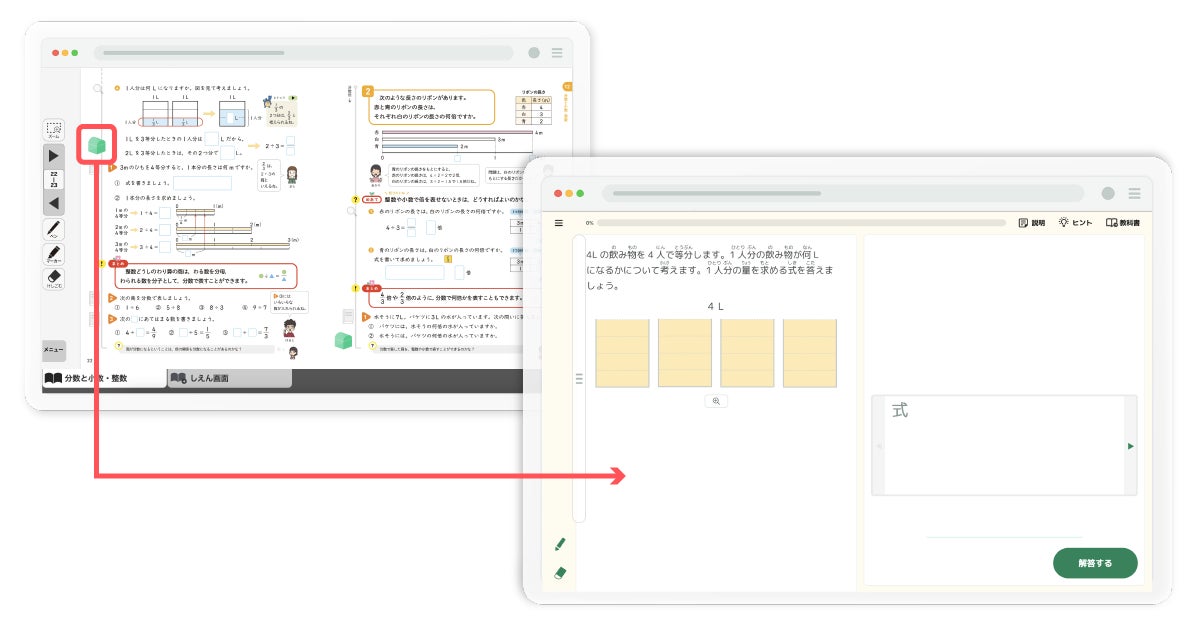 デジタル教科書と、教科書に準拠した問題を搭載したキュビナのAI型教材の双方をシームレスに相互接続することで、教科書と教材を行き来しながら、子どもたちにとってより学びやすく、より個別最適に学ぶことができます。