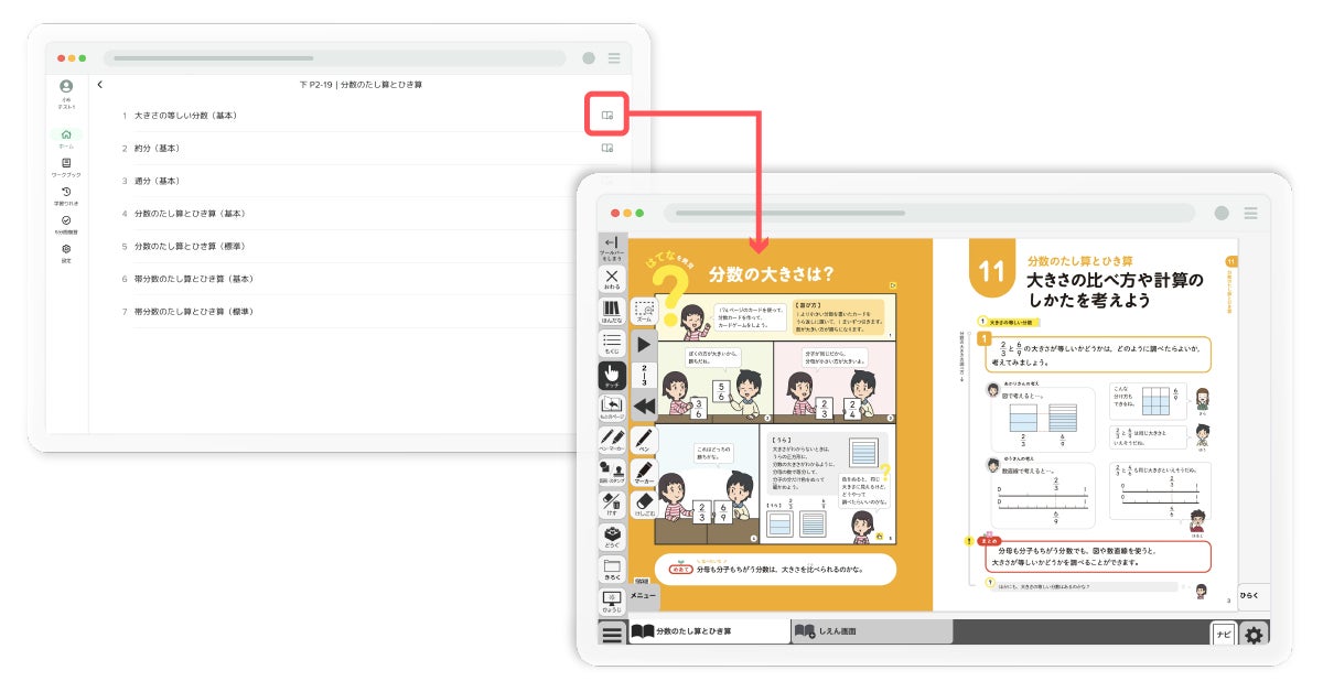 キュビナの問題画面に表示された教科書のアイコンをタップすることで、対応するデジタル教科書の該当ページにジャンプし、教科書で学習することができます。一つひとつの問題だけではなく、単元単位、より細かい小単元ごと、さらに細かい問題グループごとに、デジタル教科書へ連携しています。