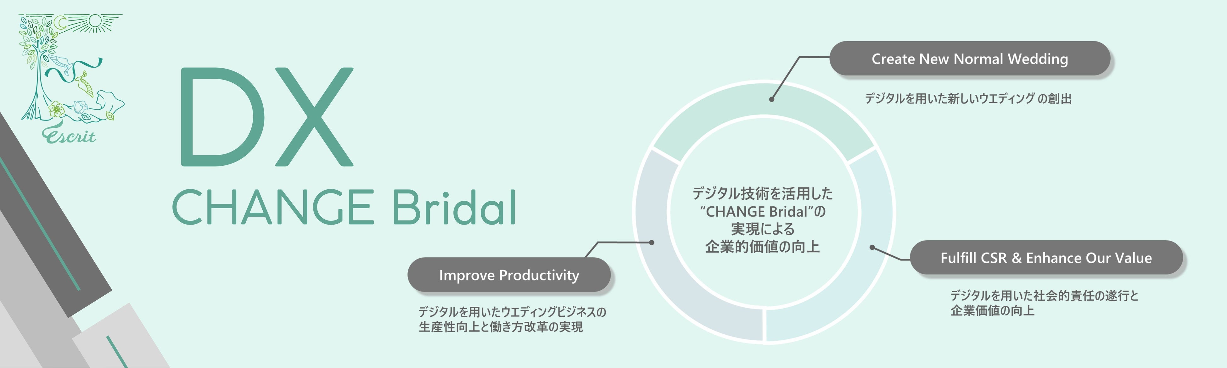 エスクリは、“CHANGE Bridal”というミッションを掲げ、デジタル技術を用いた「新しい結婚式のかたち」の創出や、ウエディングプランナーの多様な働き方改革の推進など、時代の変化に適応した取組みを行ってまいりました。