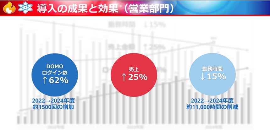 営業部員が自らDomoにログインをしてデータ活用が日常化するにつれて、受注・売上状況などの会議資料の作成、営業計画や週報などの他部⾨に開⽰する資料の作成、営業先のコンタクト分析といった業務において効率化が進み、勤務時間も減少していきました。結果として、2022年度から2024年度までの3年間で、メンバーのDomoのログイン数は62%増加し(約1,500回の増加)、勤務時間は15%減少しました(約11,000時間の削減)。また、営業部員の努力の甲斐もあり、売上は25%増加しました。