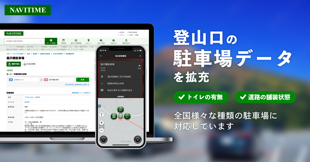 昨今屋外レジャーの需要が増加している背景を受け、この度全国の登山口の駐車場データにも対応し、トイレの有無や道路が舗装されているかどうかといった情報も提供いたします。登山計画から当日のナビゲーションまで便利にご活用いただければと思います。