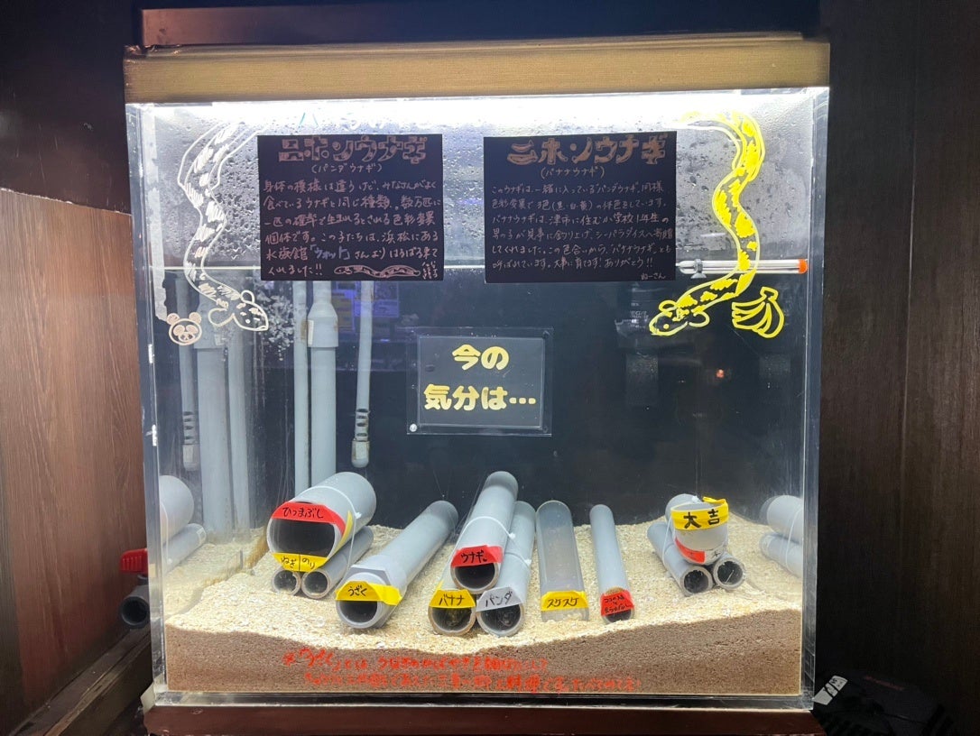 ウナギが入るパイプにはそれぞれ名前が付いており、鑑賞した際に入っているパイプがウナギの気分という水槽です。また大吉や小吉、末吉のパイプに入っている場合は、見ている人の"運勢"も占うこともできます。