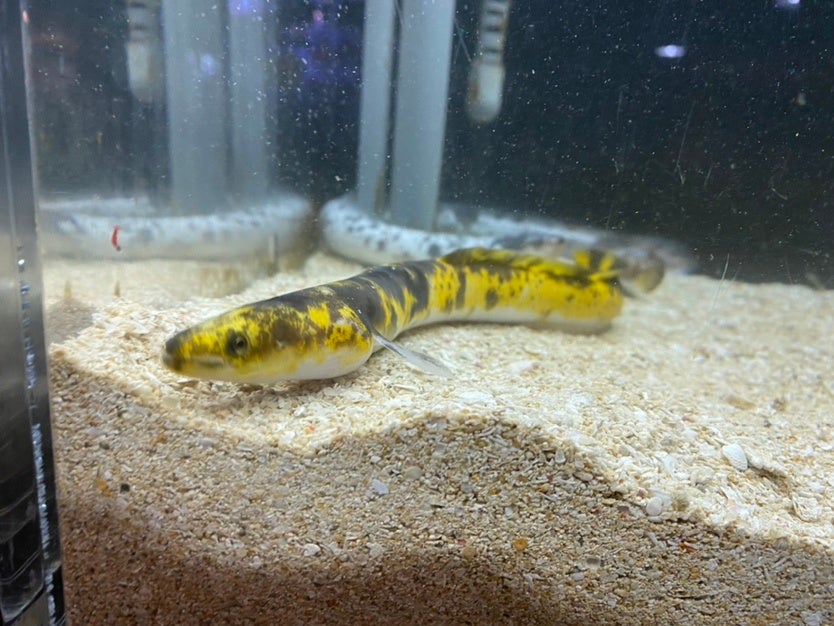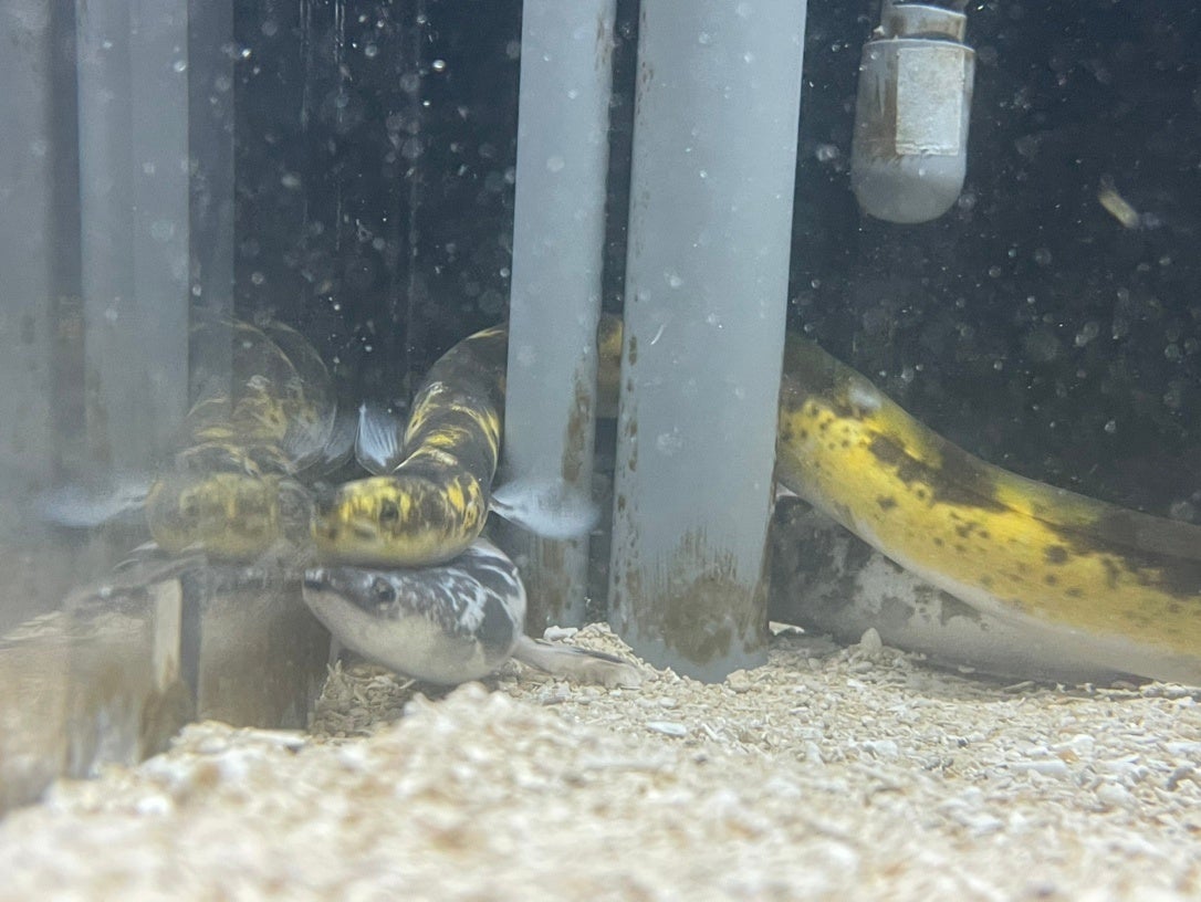 このウナギは一緒に入っている"パンダウナギ"同様、色彩変異で3色(黒・白・黄)の体色をしています。この色合いから「バナナウナギ」とも呼ばれています。バナナウナギは、津市に住む小学1年生の男子児童が見事に釣り上げ、伊勢シーパラダイスへ寄贈してくれました。大事に育てます!ありがとう!!