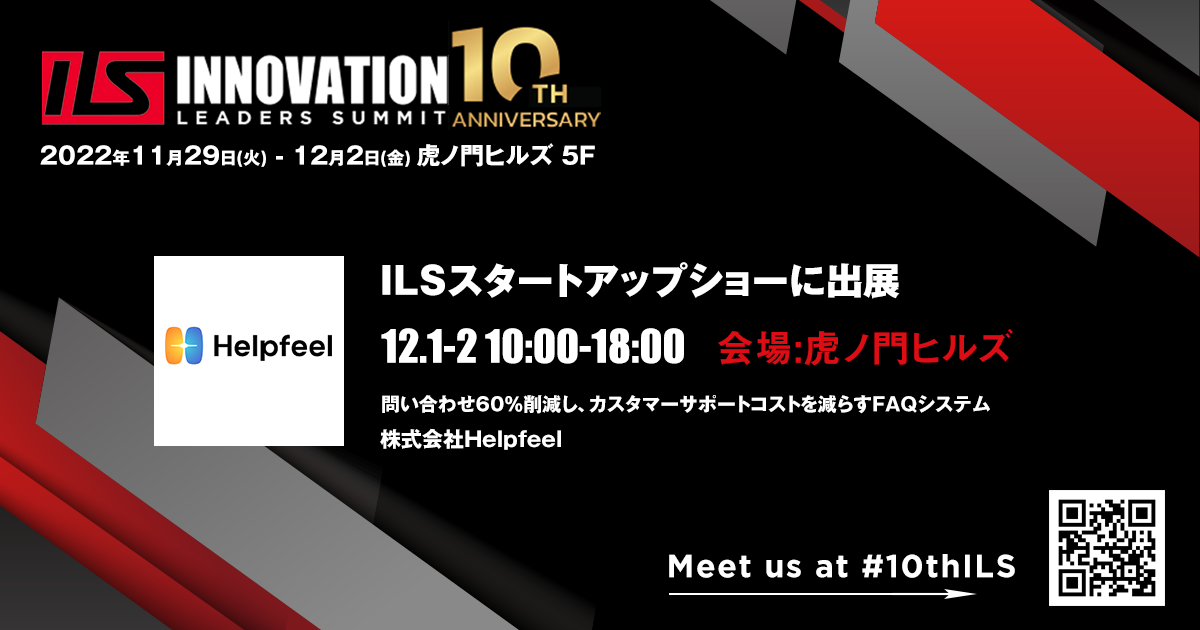 株式会社Helpfeel(京都府京都市 代表取締役/CEO:洛西一周 以下、弊社)はこのたび、「第10回 INNOVATION LEADERS SUMMIT」(以下「第10回ILS」)で、ピッチ登壇およびブース出展することをお知らせいたします。