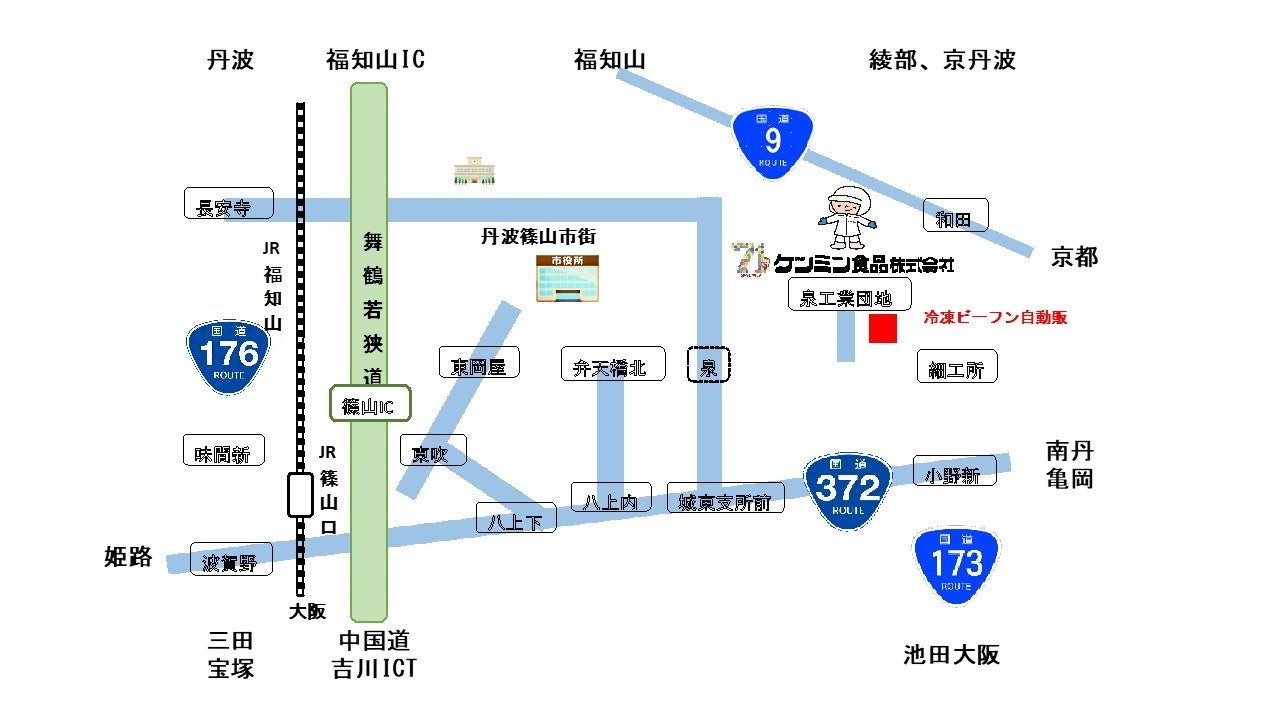 ● ケンミン食品篠山工場は1978年に操業を開始。1986年に冷凍調理焼ビーフンを製造・販売以来、冷凍食品の基幹工場として商品を作り続けています。篠山工場で作るケンミンの冷凍ビーフンやはるさめを地元の方に知っていただくとともに、いつでも簡単にご購入できる環境を整えたいと考え、篠山工場前に2021年11月1日に冷凍ビーフン自販機を設置しました。工場から自動販売機まで物流費が掛からないこと、日頃お世話になっている地元の方への感謝の気持ちを込めて、篠山工場自動販売機限定の工場直売価格として20%OFFで販売しています。