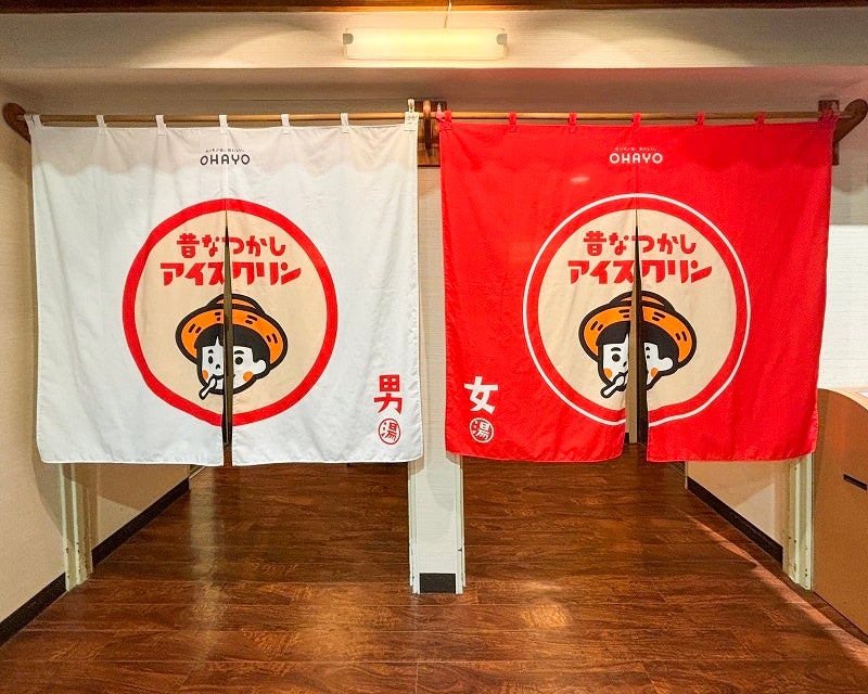 11月15日(金)〜11月30日(土)期間中、草加健康センターの正面玄関や浴室入り口の暖簾が「昔なつかしアイスクリン」のオリジナル暖簾に!