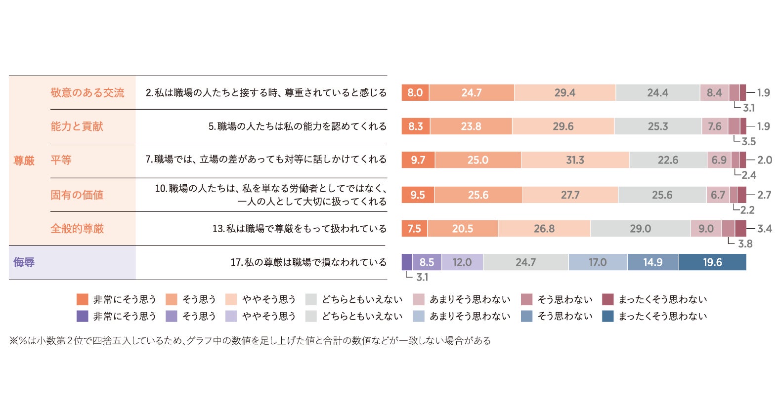 ・「尊厳」に関する5つの尺度(「敬意のある交流」「能力と貢献」「平等」「固有の価値」「全般的尊厳」)の項目例(「私は職場の人たちと接する時、尊重されていると感じる」など)に「非常にそう思う」と回答したのは1割に満たなかった。「ややそう思う」まで含めると約6割が職場では尊厳が保たれていると感じている。