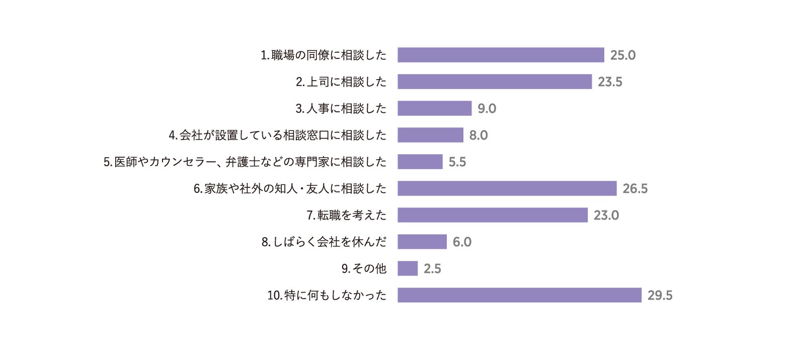 ・また、4人に1人は「2.身近に相談できる人がいなかったから」を選択した。「3.社内に相談できる窓口や担当部署がなかったから」「5.どうしたらいいか分からなかったから」という回答も一定数あった。