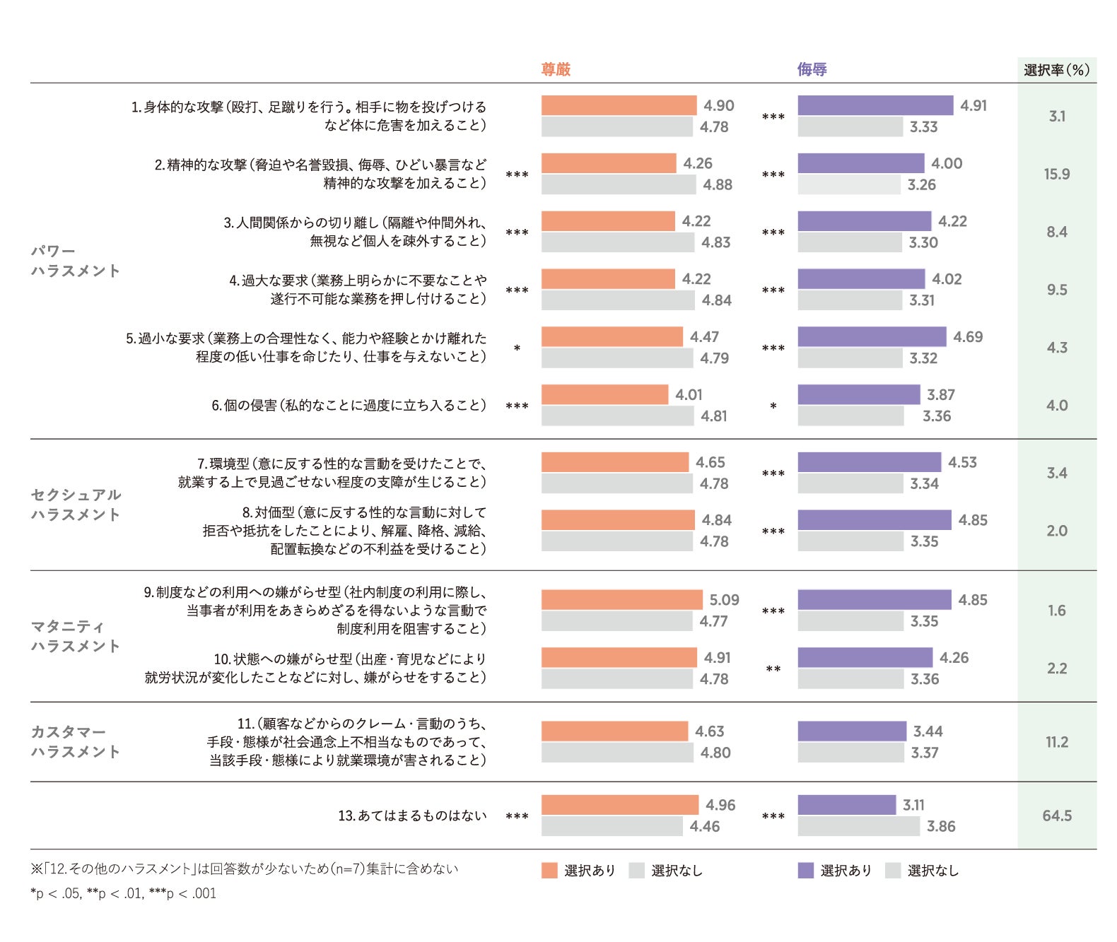 ・被ハラスメント経験の有無別に「尊厳」「侮辱」の得点を示した。全体の3人に1人は現在の勤務先で何らかのハラスメントを受けた経験を有していたが、ハラスメント経験がない職場(「13.あてはまるものはない」)では「尊厳」が高く、「侮辱」が低い傾向が、ハラスメント経験がある職場では、総じて、「侮辱」が高い傾向が確認された。
