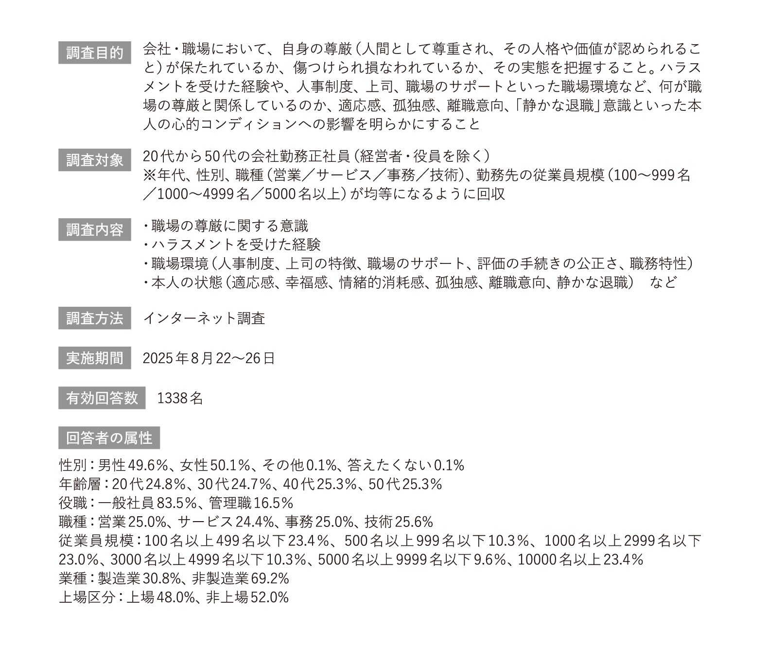 相対的に雇用環境が保護されている正社員であっても、職場において尊厳(人間として尊重され、その人格や価値が認められること)が損なわれ得ることを鑑み、その実態を明らかにしたいと考え、20代から50代の正社員を対象に各年代、性別、職種、勤務先の従業員規模に偏りが生じないように調査を行いました。