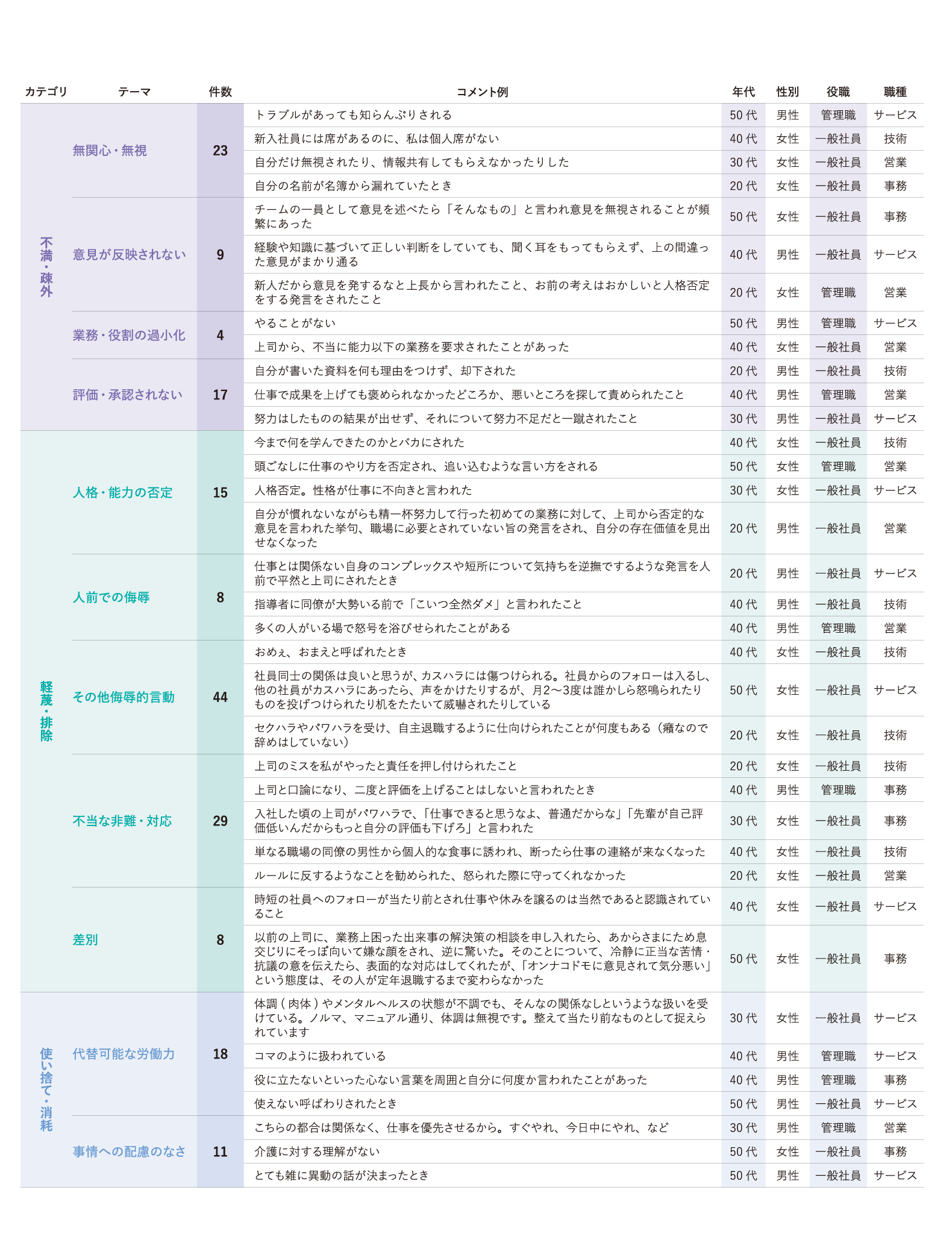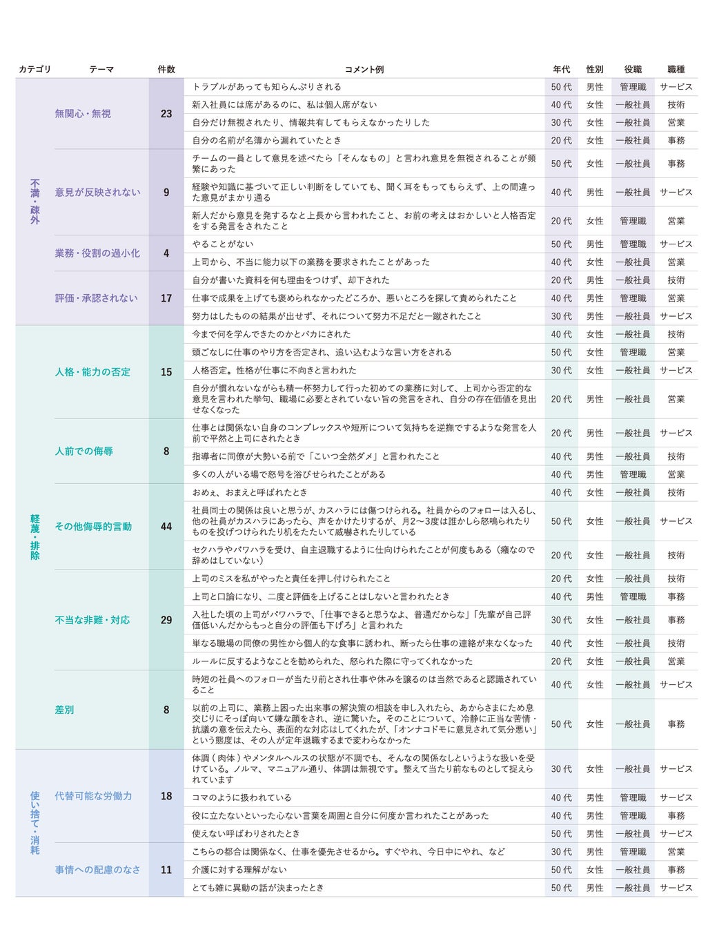 Q:現在お勤めの会社・職場において、ご自身の尊厳(人間として尊重され、その人格や価値が認められること)が傷つけられた、損なわれたと感じた経験として、どのような出来事がありましたか。具体的な内容やエピソード、どのような関わりがあってそう思ったのか、どのような気持ちになったのかなど、差し支えない範囲でかまいませんので、お書きください。〈自由記述より抜粋〉