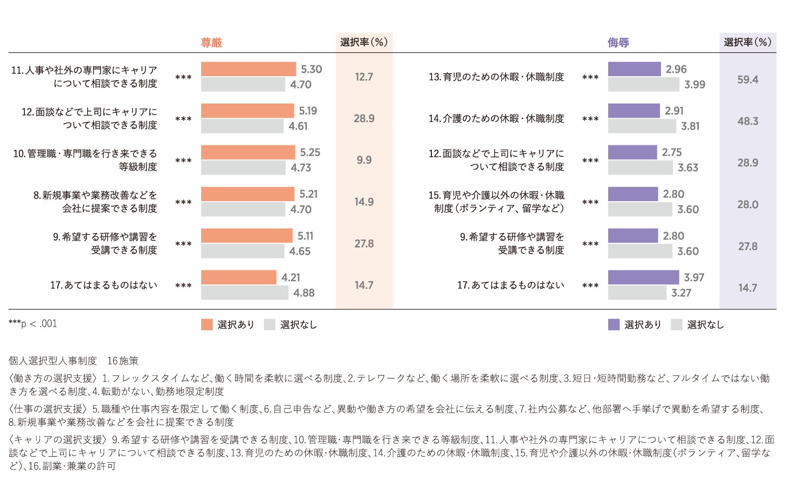 ・働き方やキャリアに関して主体的に選択する機会を提供する個人選択型人事制度の会社への導入有無を尋ね、制度の導入有無が職場の尊厳に関係するのかを確認した。「尊厳」の得点差が大きい5つの施策は、「11.人事や社外の専門家に/12.面談などで上司にキャリアについて相談できる制度」「10.管理職・専門職を行き来できる等級制度」「8.新規事業や業務改善などを会社に提案できる制度」「9.希望する研修や講習を受講できる制度」であった。
