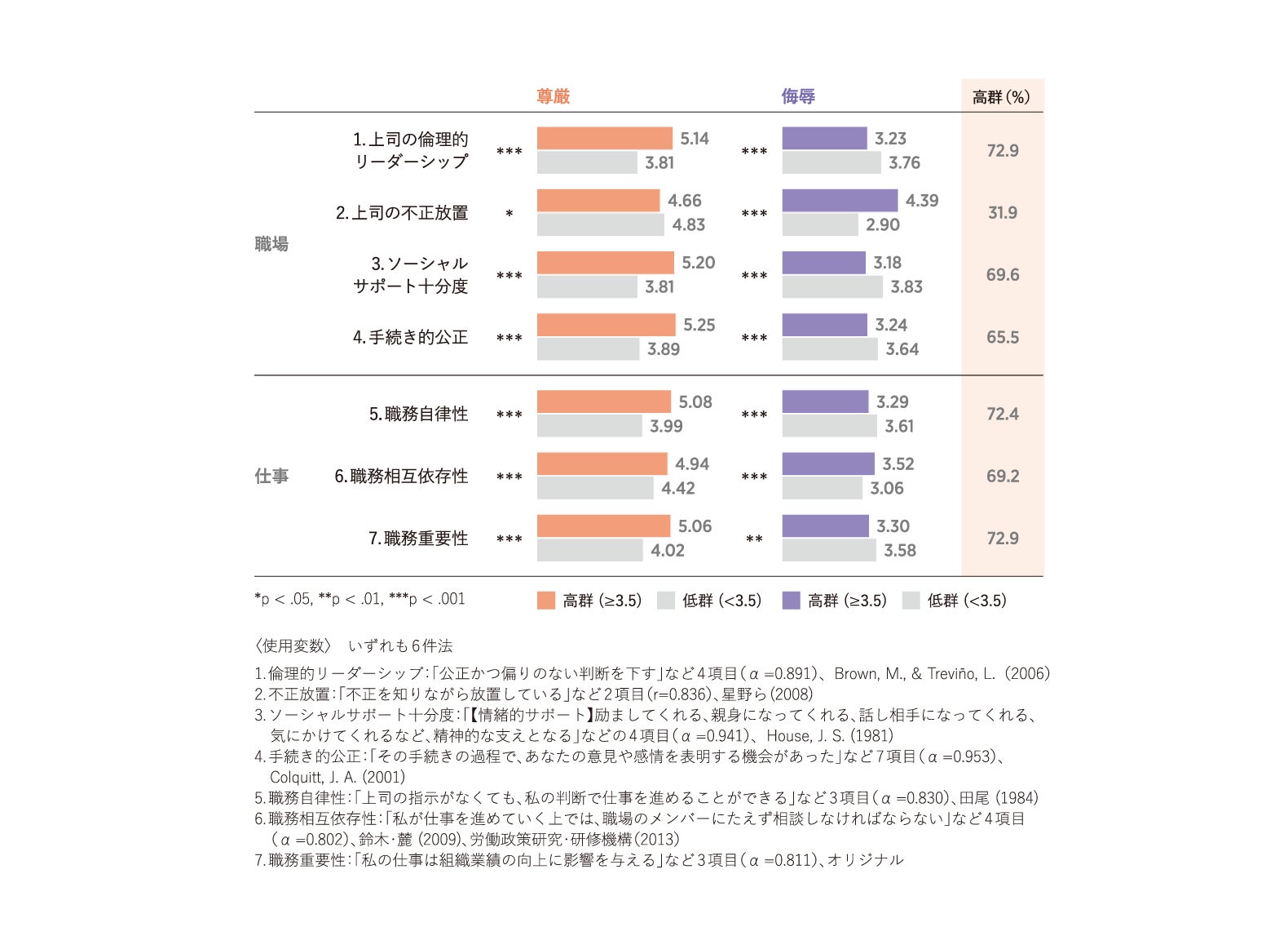 ・ 職場環境として、直属の上司の倫理的態度、周囲のサポート、評価の手続きの公正さ、職務特性を挙げ、「尊厳」「侮辱」との関係について確認した。相対的に得点差が大きかった項目として、「尊厳」については「3.ソーシャルサポート十分度」「4.手続き的公正」「1.上司の倫理的リーダーシップ」の高群の方が高く、「侮辱」については「2.上司の不正放置」の高群、「3.ソーシャルサポート十分度」の低群の方が高い。また「6.職務相互依存性」が高いと「尊厳」「侮辱」共に高い。