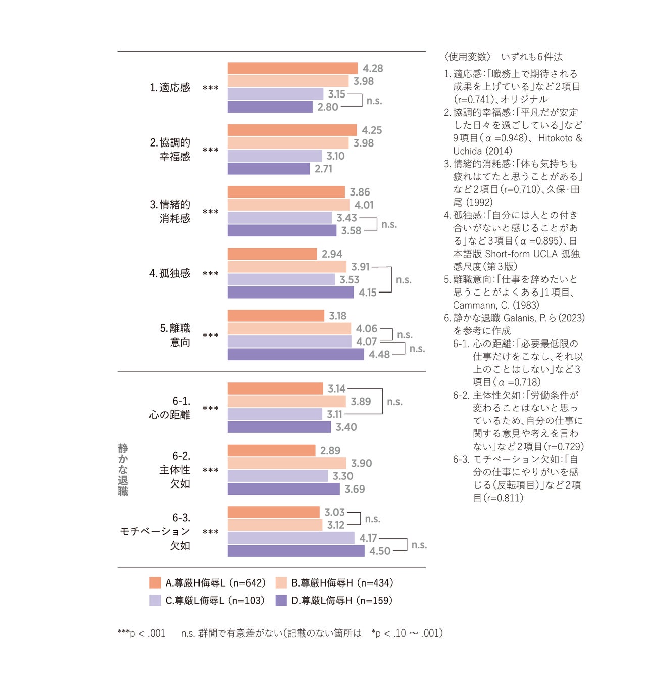 また、「尊厳」が高くても「侮辱」も高い状態の人は32.4%存在し、適応感は高いものの、内心では孤独感や離職意向を抱えていることがうかがえました。「静かな退職」との関係も見られ、尊厳を高めるだけでなく、尊厳を損なう要素の排除が重要であることが認識されました。