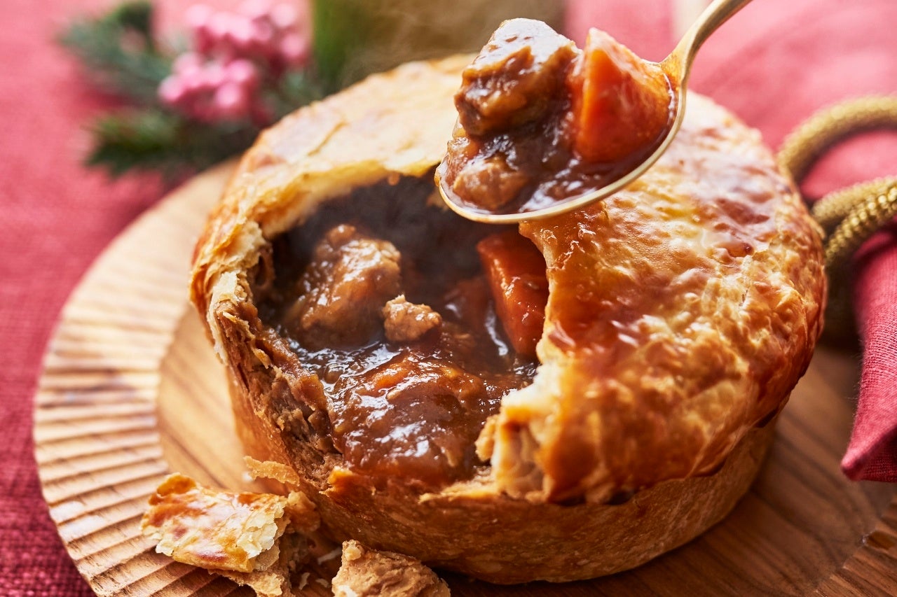 サクサクのパイ生地を崩しながら食べる楽しさに、丁寧に煮込んだ牛すじ肉と、マッシュルームの旨み、食感を残した野菜、デミグラスソースが相性抜群です。