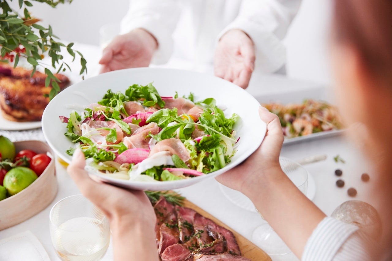 子どもから大人までご家族みんなで楽しめる、RF1の人気商品を含む4品(牛肉のグリル 霜降りひらたけロースト添え/桜島どりのもも肉ロースト/たっぷり海の幸の美味サラダ/北海道産生ハムとルッコラの華やぎサラダ)の詰め合わせ。