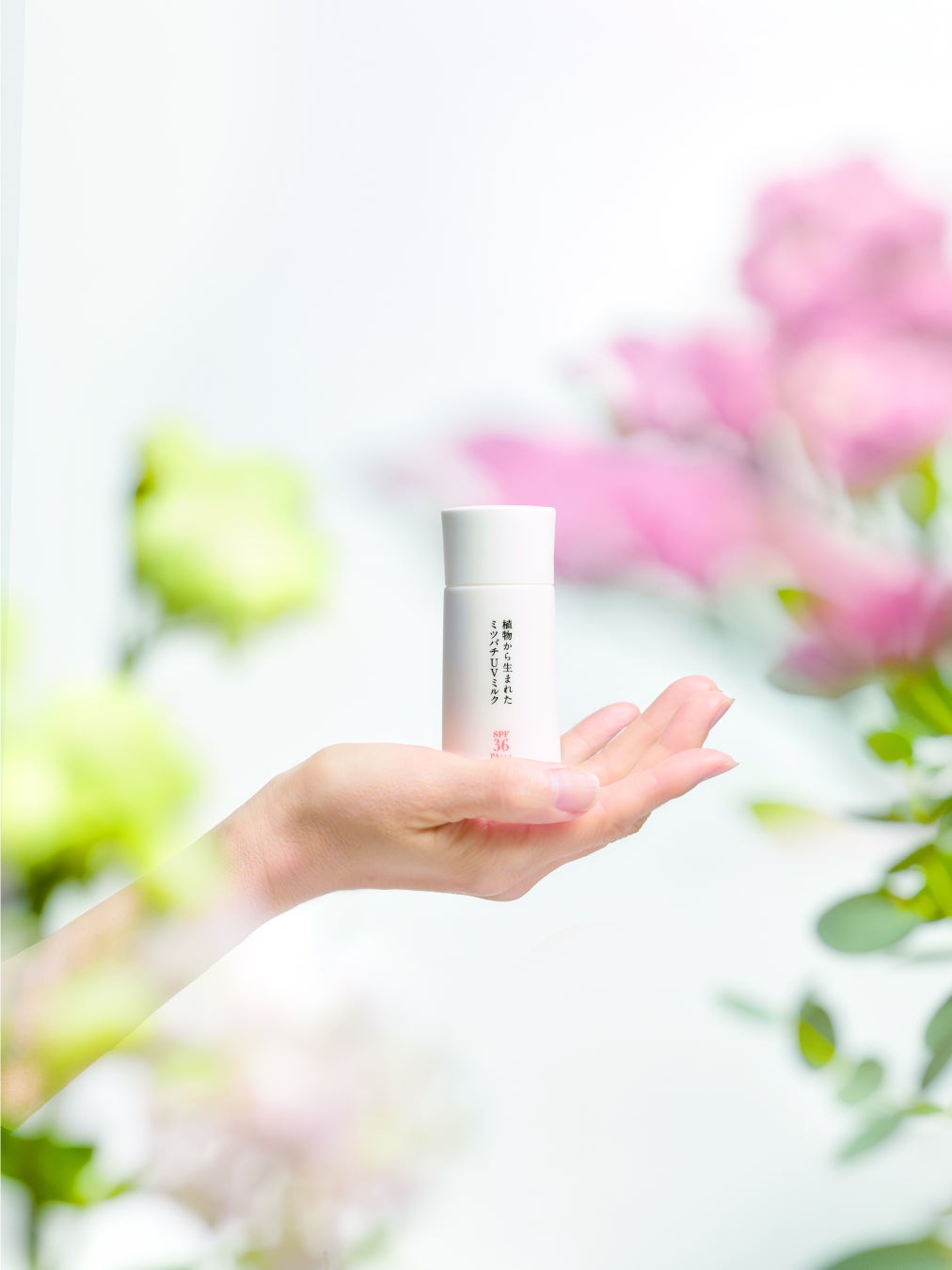 玄米にたった 0.04%しか含まれない希少なコメヌカ由来「フェルラ酸」を活かすことで、化学合成の紫外線吸収剤はもちろん、天然ミネラルの紫外線散乱剤すらも配合しない、ノンケミカルをさらに一歩進める日本初(※)の日やけ止めを完成させることができました。このミツバチUVミルクは、植物の力のみでの紫外線カットの限界SPF10を大きく超えるSPF36を実現し、さらにエッセンスミルクのような心地良い使いごこちを実現することができました。