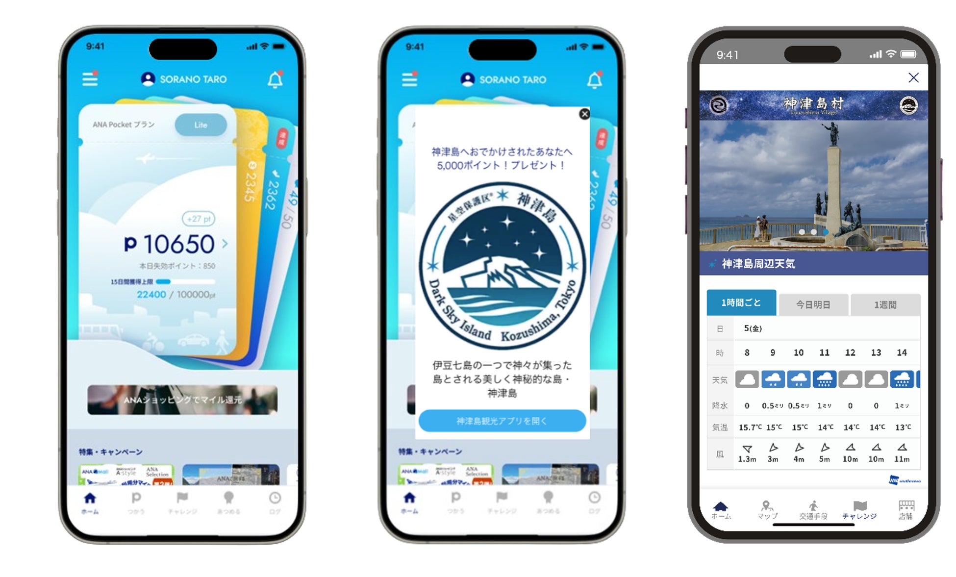 航空移動だけではなく、徒歩、電車、車、フェリー、飛行機などの日常の移動でポイントが貯まり、ANAのマイルや様々な特典に交換出来るスマートフォンアプリ「ANA Pocket」。移動をゲーム感覚で楽しめる「チャレンジ」などの仕掛けで、移動に対する付加価値を創出し、地域活性化やエコな移動への行動変容の機会の提供をしています。