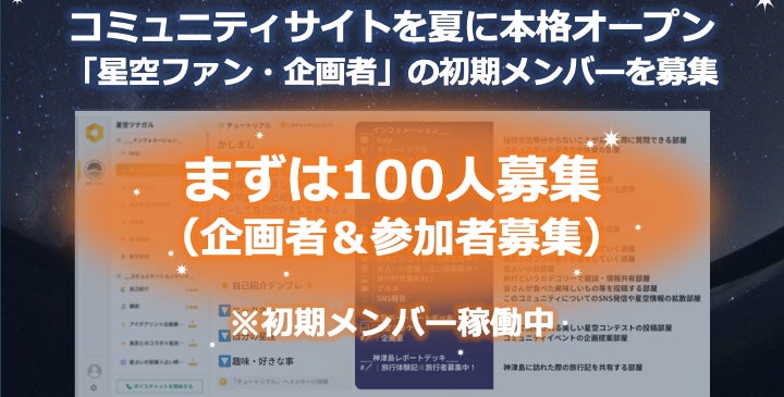 日本中の星空好き、星空ファン同士、地方創生や新しい観光の姿に興味がある人が主体的に参加・企画等を行い共同で運営し、島民や全国の団体と事業共創を行う方式の最新のデジタル技術を最大限利活用した新たなファンクラブ・コミュニティを構築していきます。