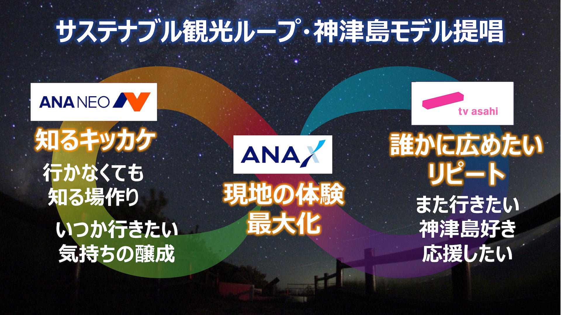東京都 神津島村(村長:前田 弘、以下「神津島村」)は、「東京宝島 サステナブル・アイランド創造事業*1」において、東日本電信電話株式会社 東京西支店(支店長:上田 達、以下「NTT東日本」)、ANA NEO株式会社(代表取締役社長:冨田 光欧、以下「ANA NEO」)、ANA X株式会社(代表取締役社長:神田 真也、以下「ANA X」)、株式会社テレビ朝日(代表取締役社長:篠塚 浩、以下「テレビ朝日」)と連携し、観光分野において、新たな概念である「サステナブル観光ループ・神津島モデル」(以下「サステナブル観光ループ」、下記2項参照)を提唱、観光分野で新たに3つの取り組みを開始します。そして、今後もこのサステナブル観光ループを循環、発展させることで、持続的に神津島のファンを増やし、今後100年続く島の明るい未来への道筋を見出してまいります。