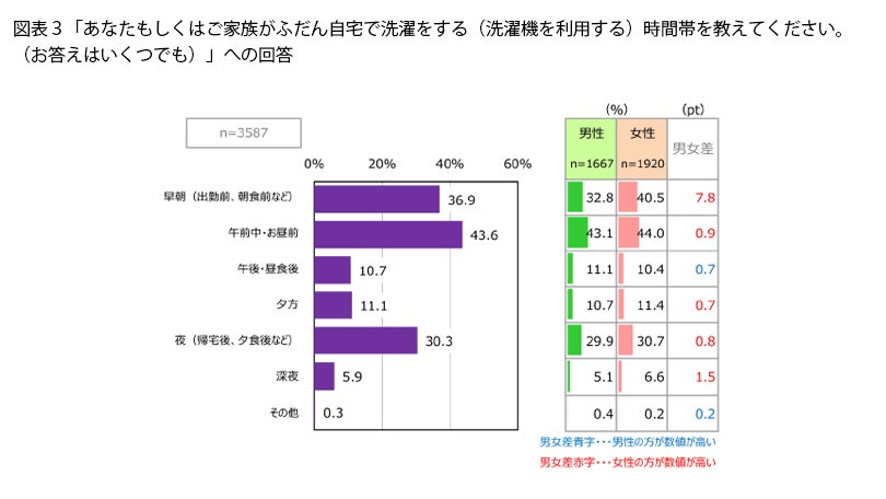 洗濯をする時間帯については(図表3)、割合が高いほうから「午前中・お昼前」(43.6%)、「早朝(出勤前、朝食前など)」(36.9%)、「夜(帰宅後、夕食後など)」(30.3%)の順でした。