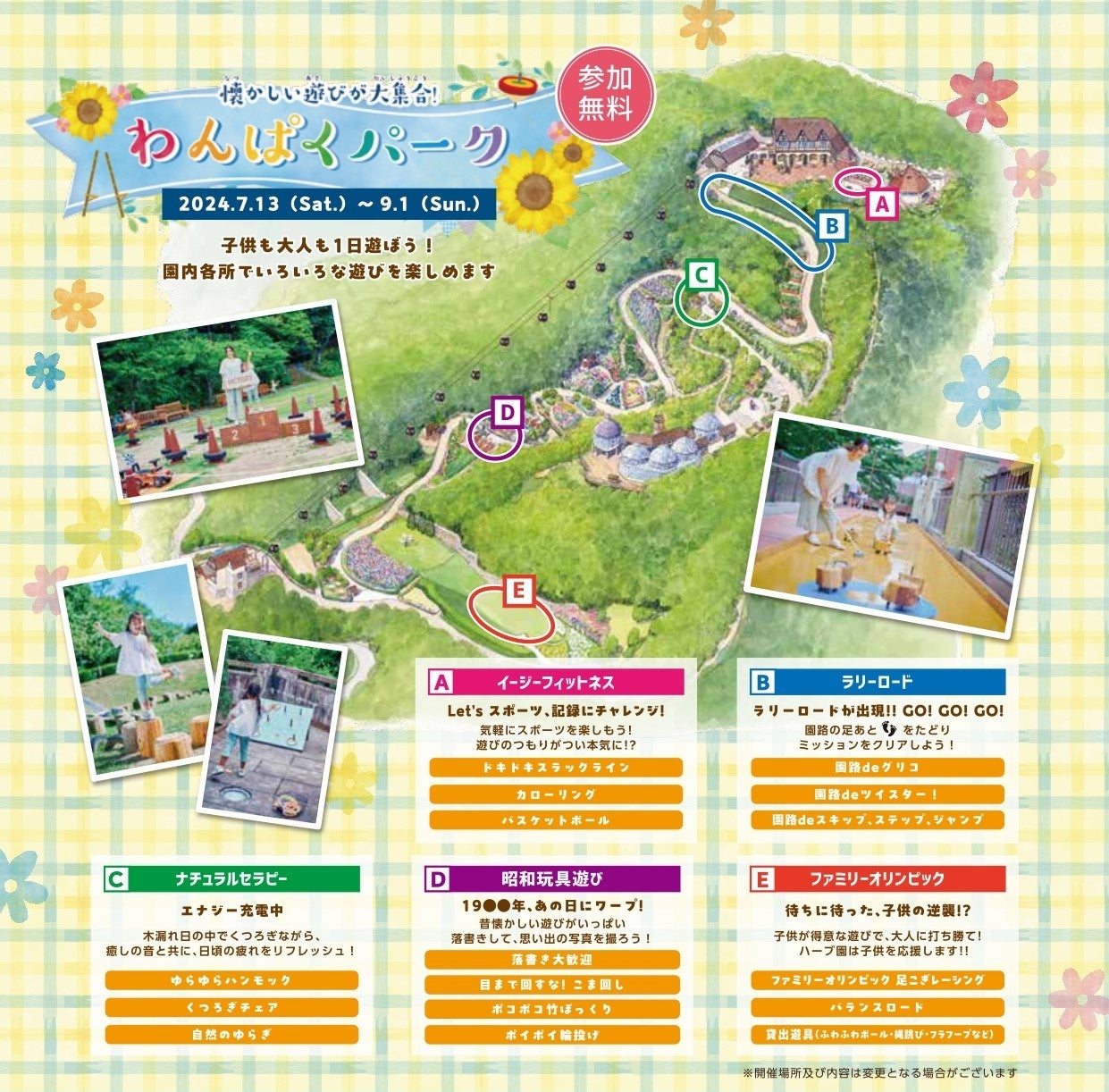 園内各所に「5つのテーマ」を設けた約30の遊びが登場、子供も大人も丸1日お楽しみいただけます