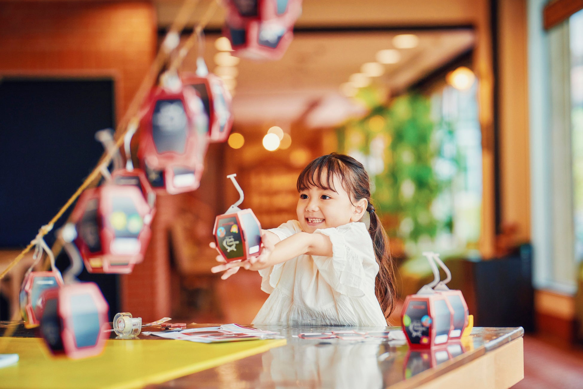 可愛いロープウェイ型のペーパークラフトは、完成すると貯金箱として使えます