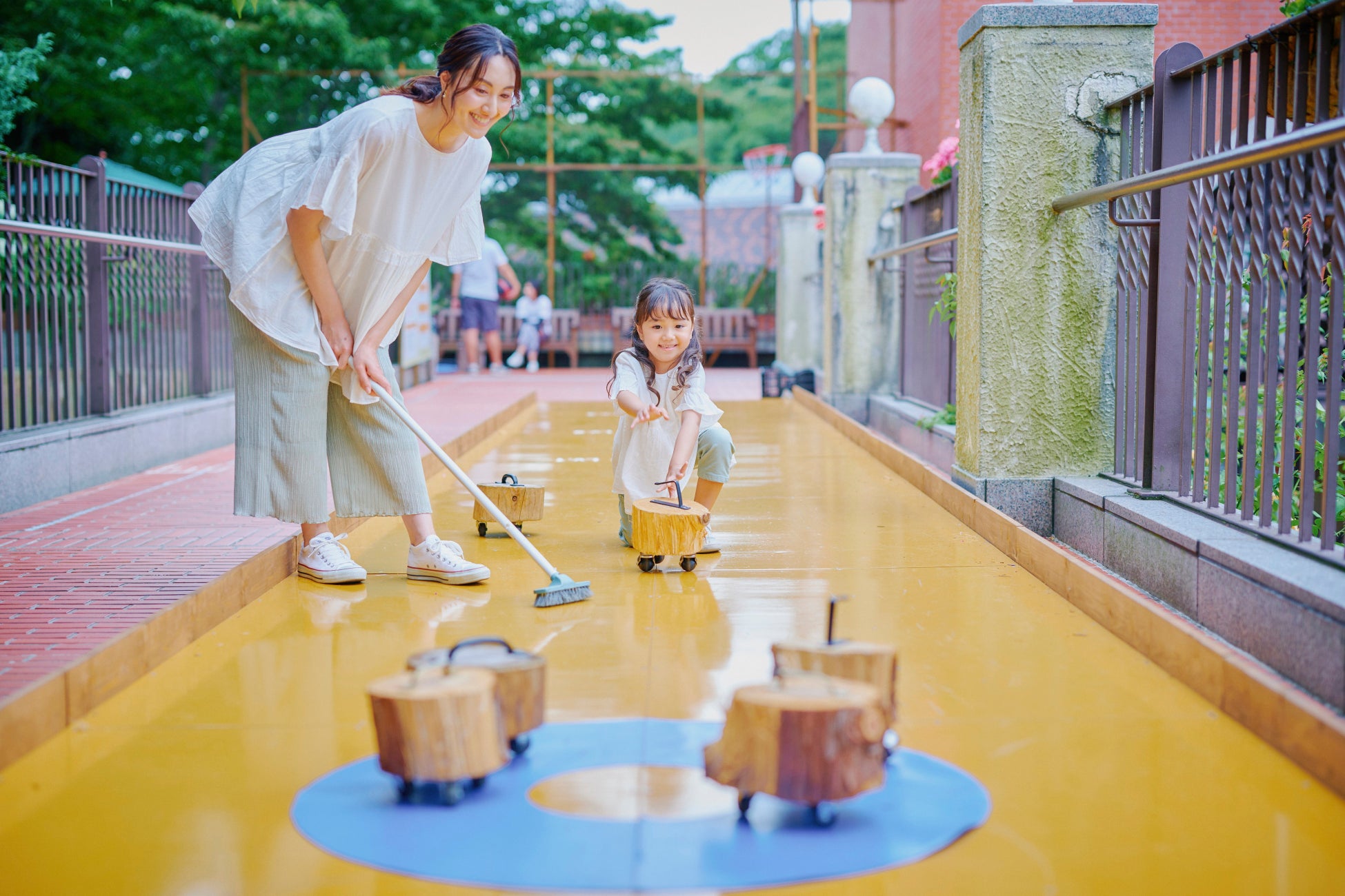 ・カロ―リング:氷上で行うカーリングをイメージしたスポーツゲーム。コースにローラーを滑らし、円の中心をねらいます
